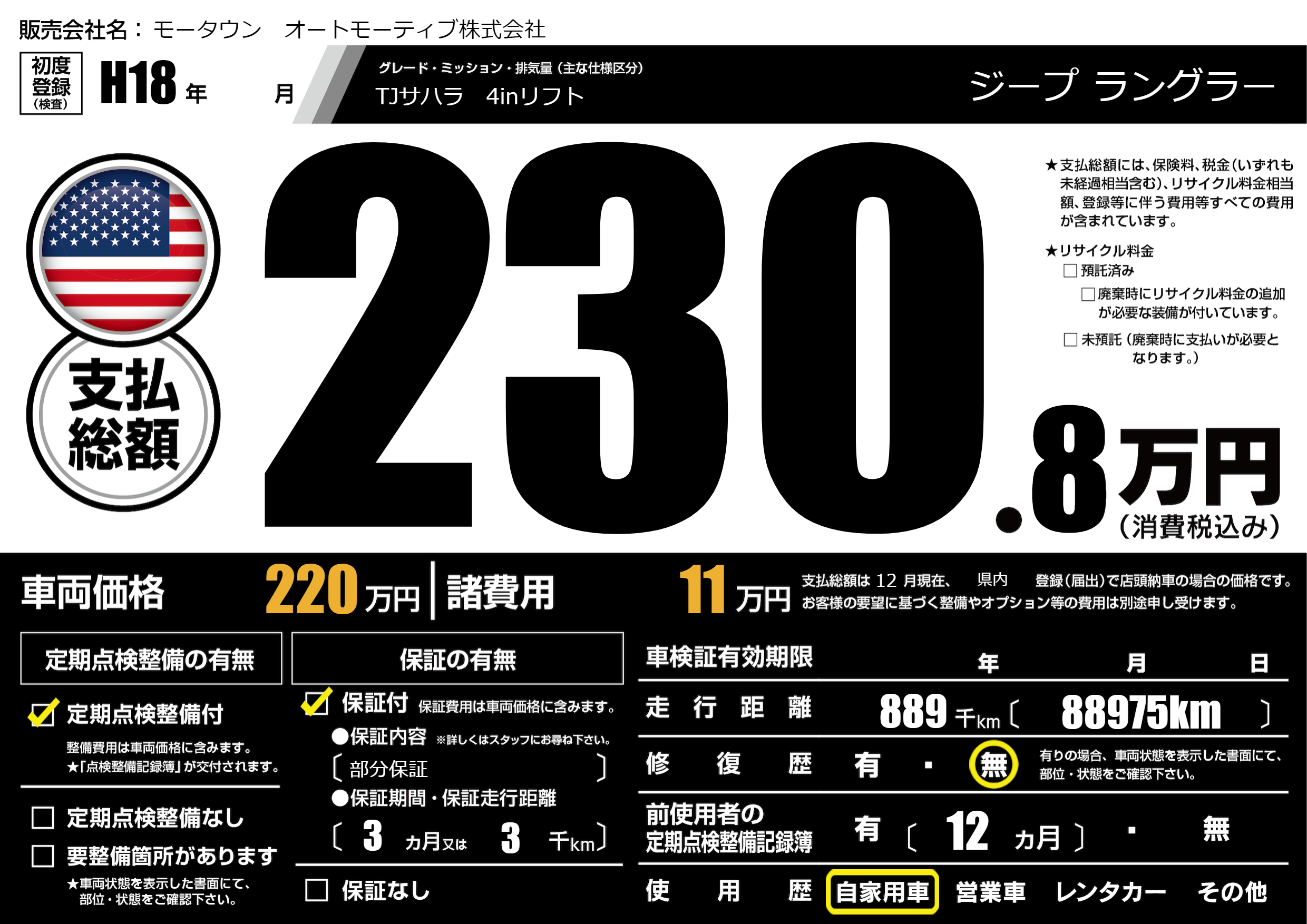 | 車名 | ジープ ラングラー | グレード ミッション 排気量 |