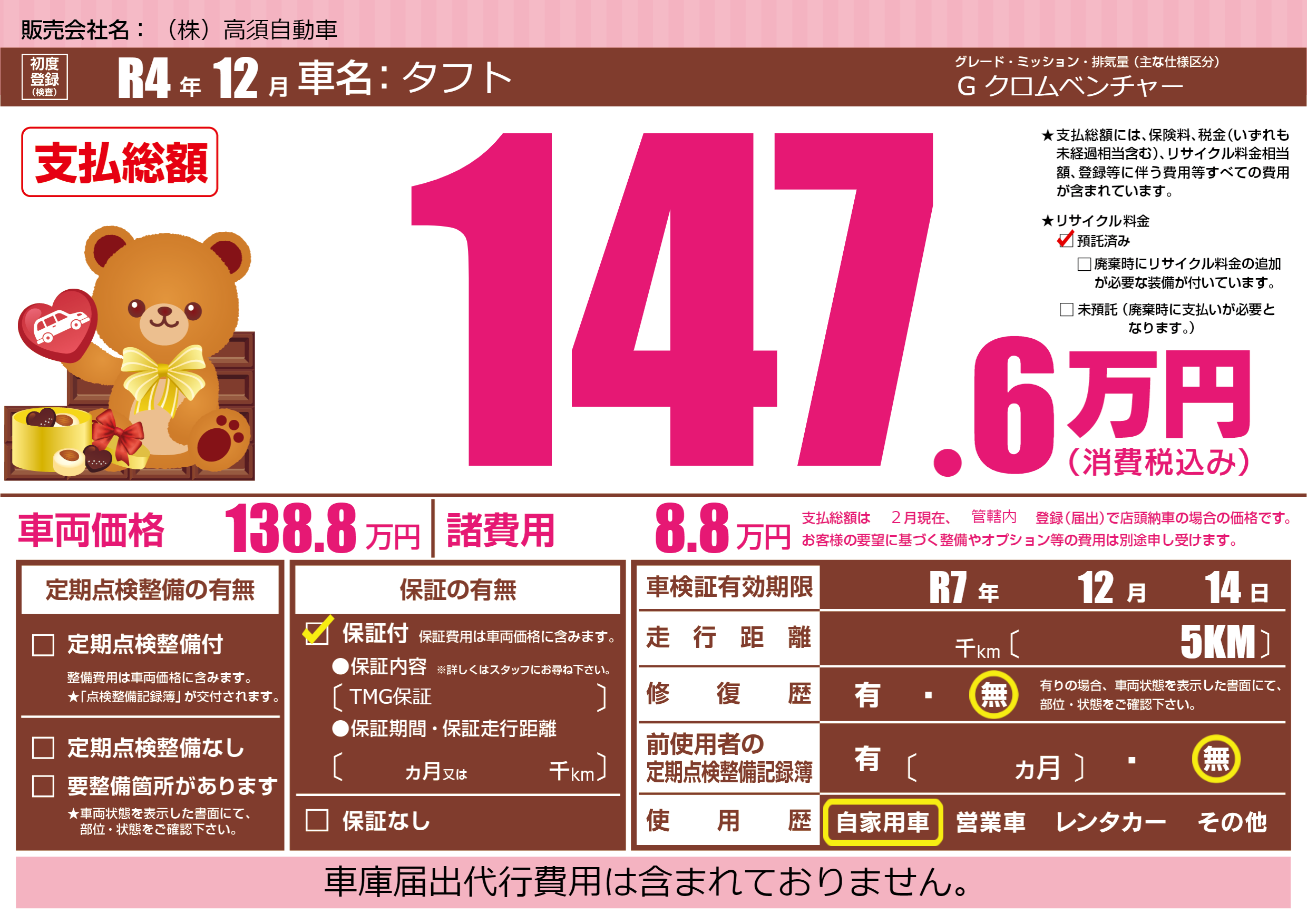 保証付き 保証内容(TMG保証) ---ヶ月または()千kmまで |