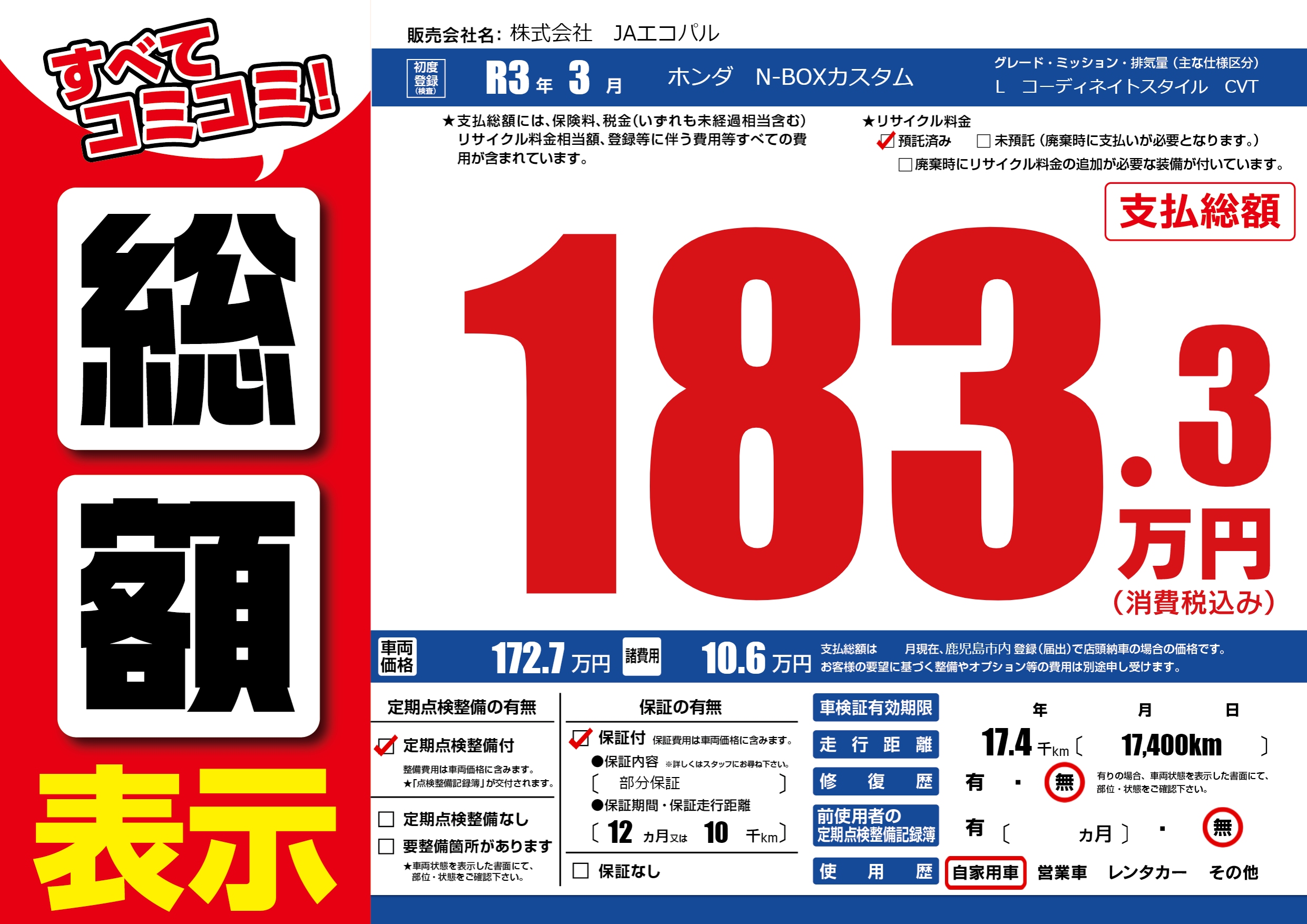 保証付き 保証内容( 部分保証) 12ヶ月または(10)千kmまで |
