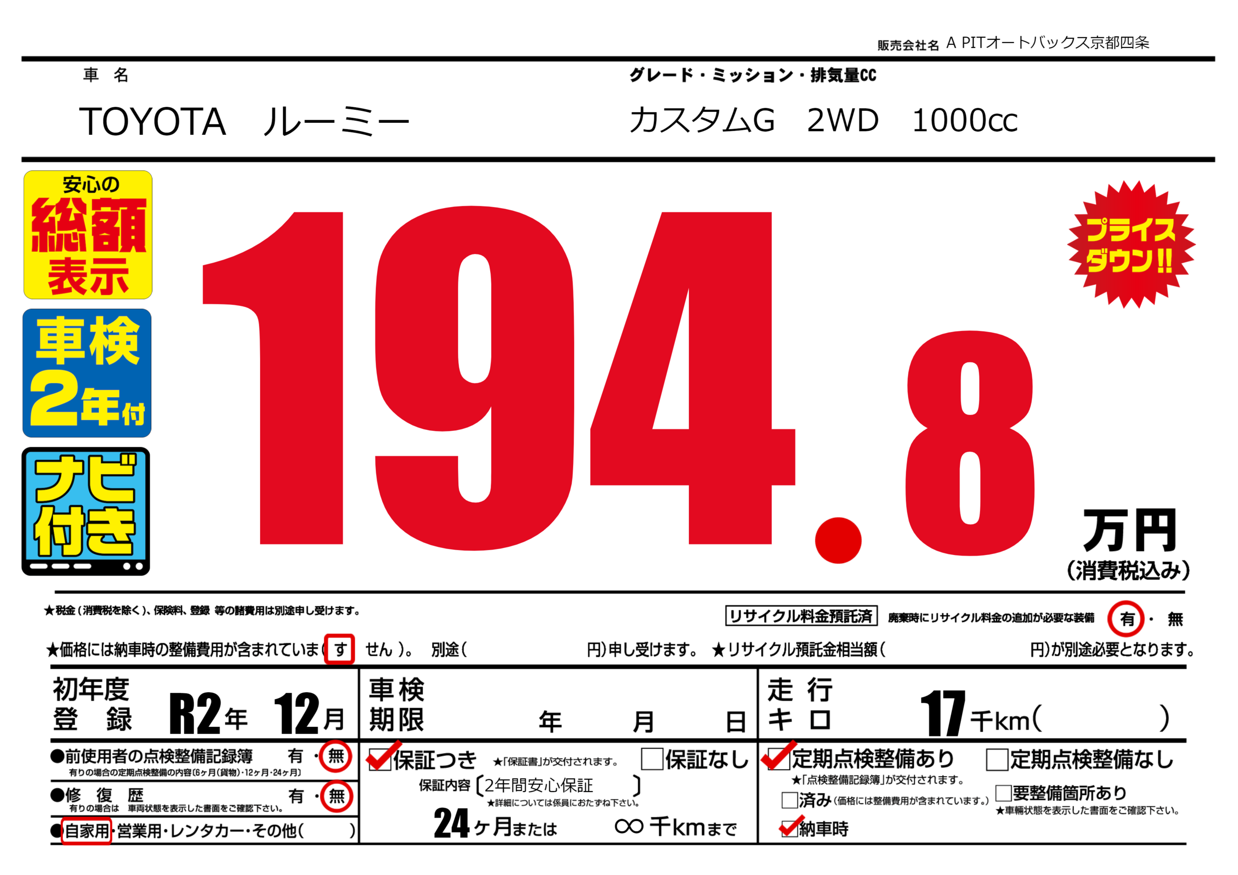 | 車名 | TOYOTA ルーミー | グレード ミッション 排気量 |
