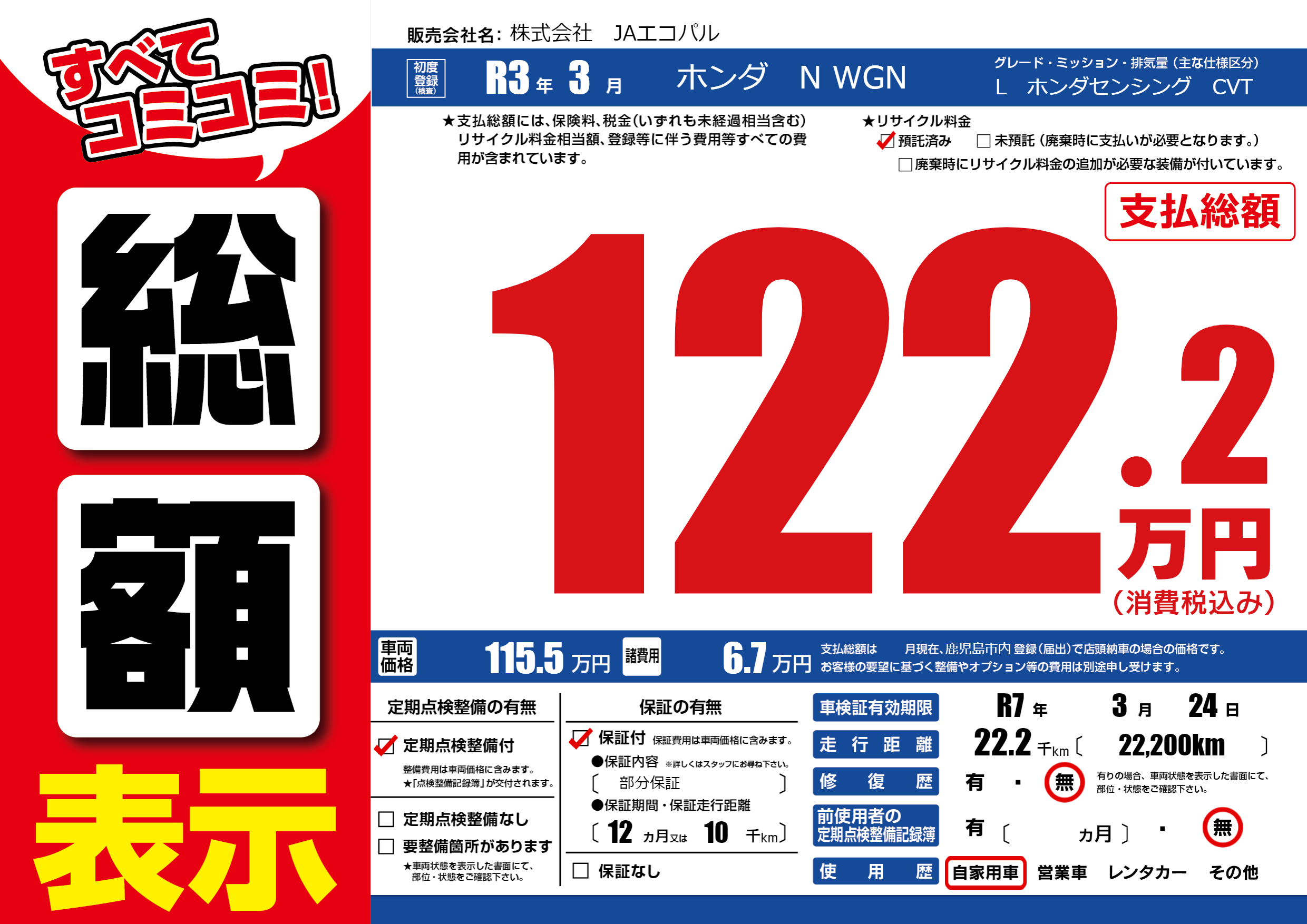 | 走行キロ | 2.2万km | 初年度登録 | R3年3月 |