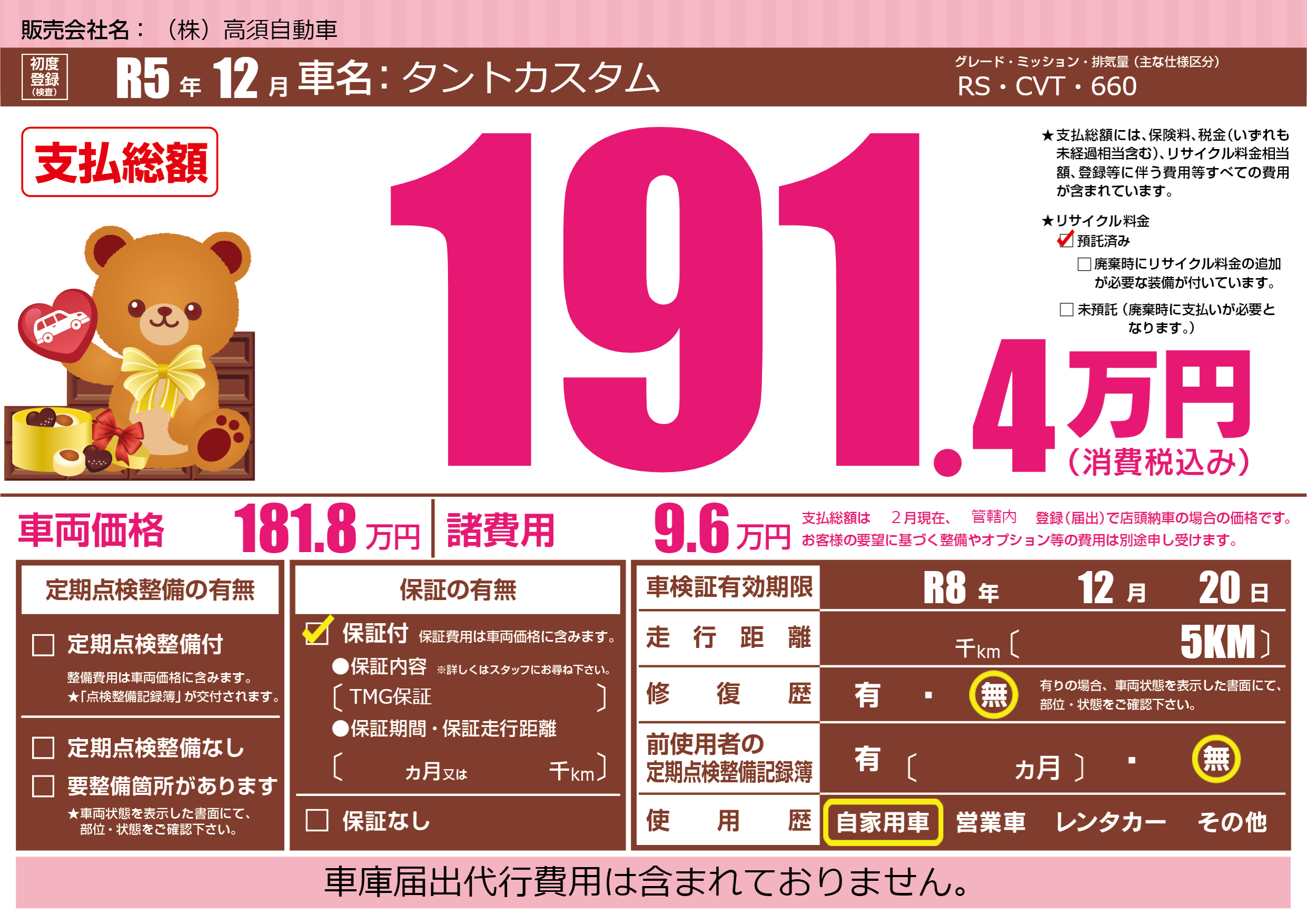 保証付き 保証内容(TMG保証) ---ヶ月または()千kmまで |