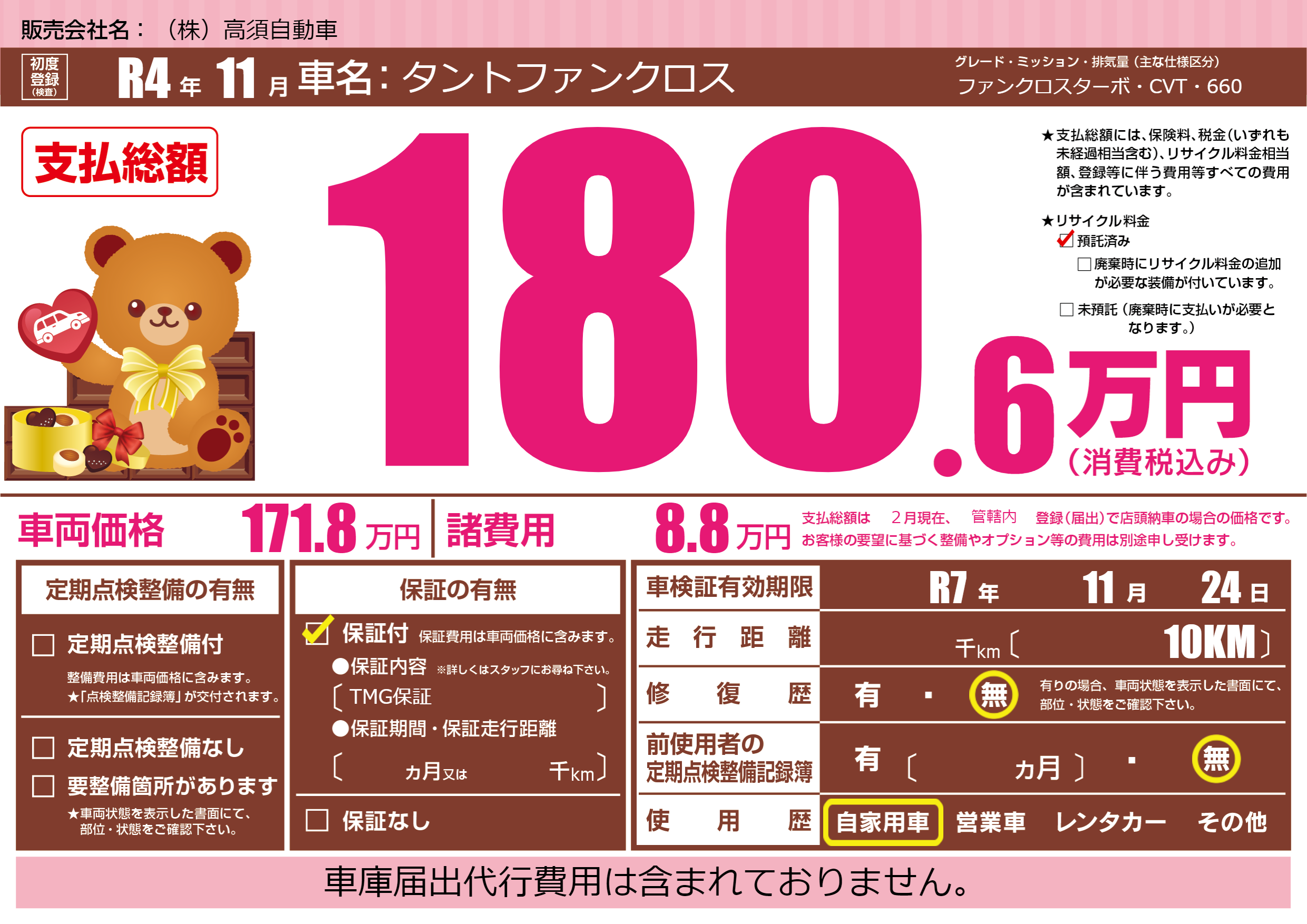 保証付き 保証内容(TMG保証) ---ヶ月または()千kmまで |