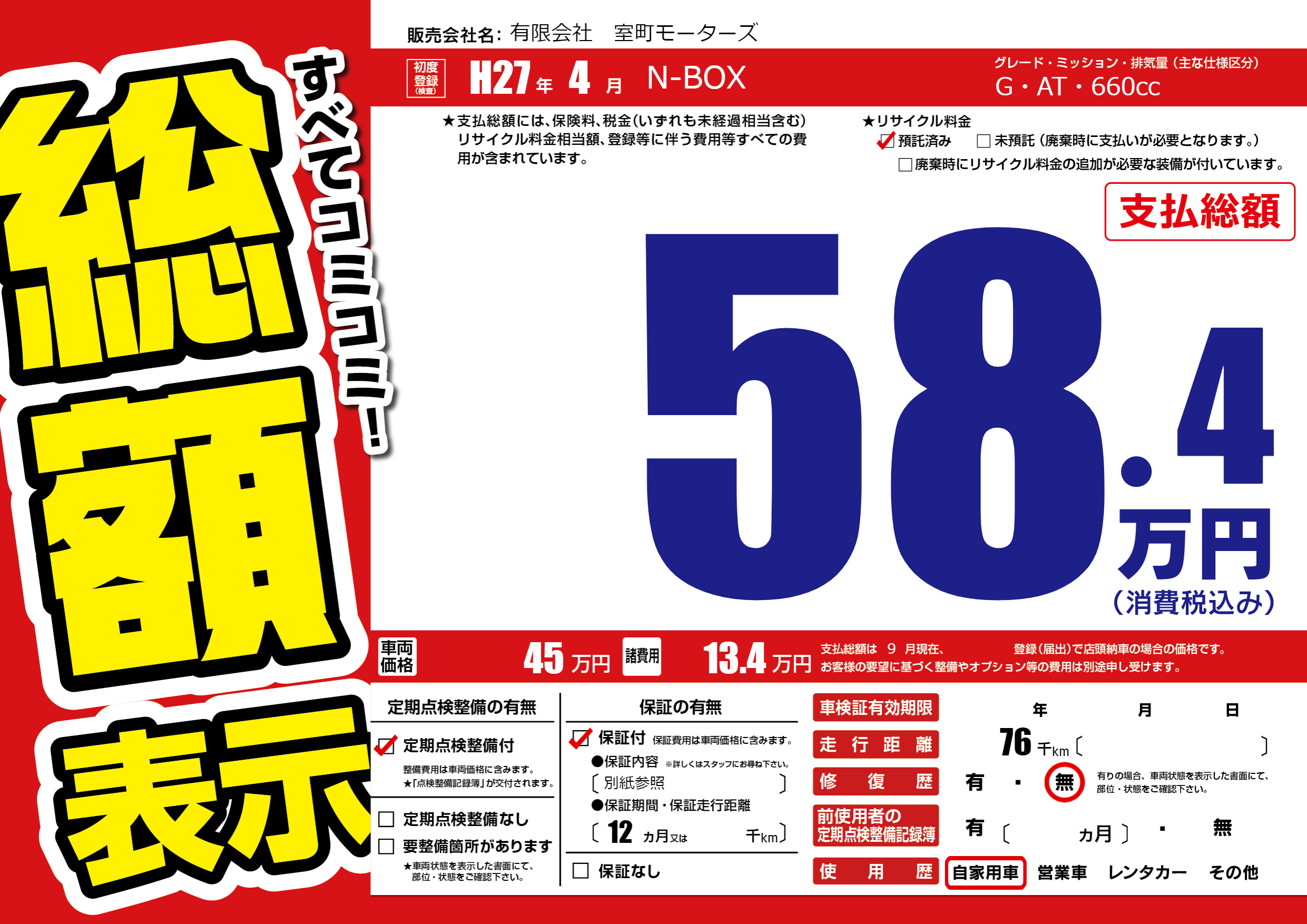 | 車名 | N-BOX | グレード ミッション 排気量 |