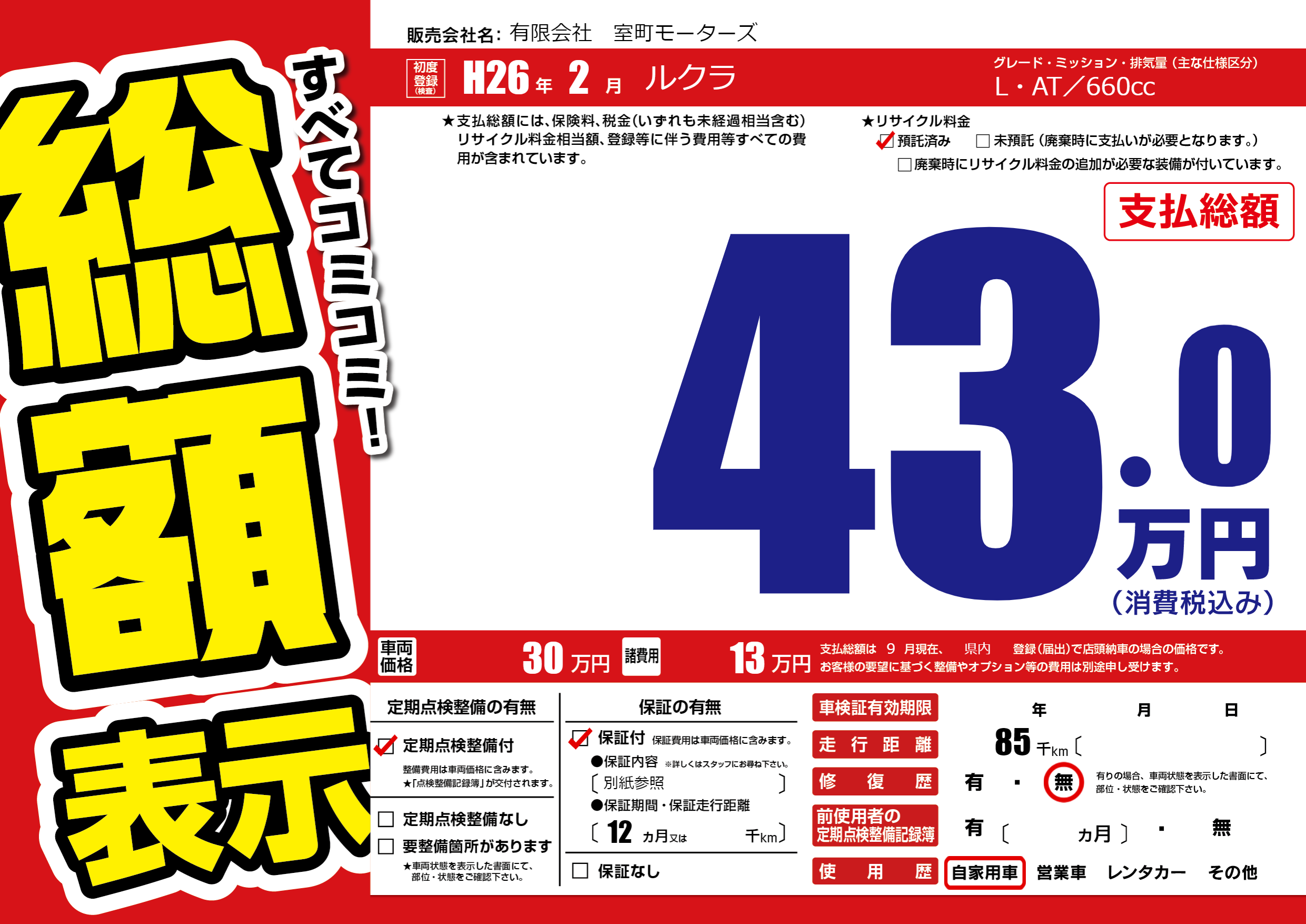| 走行キロ | 8.5万km | 初年度登録 | H26年2月 |