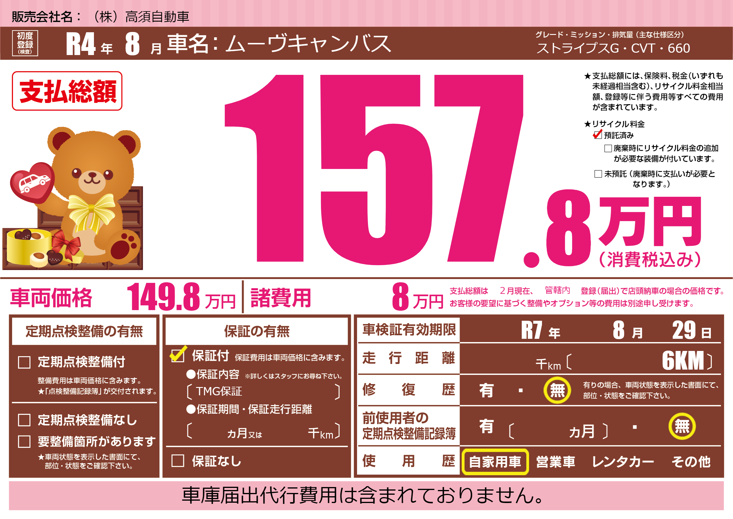 | 車名 | ムーヴキャンバス | グレード ミッション 排気量 |