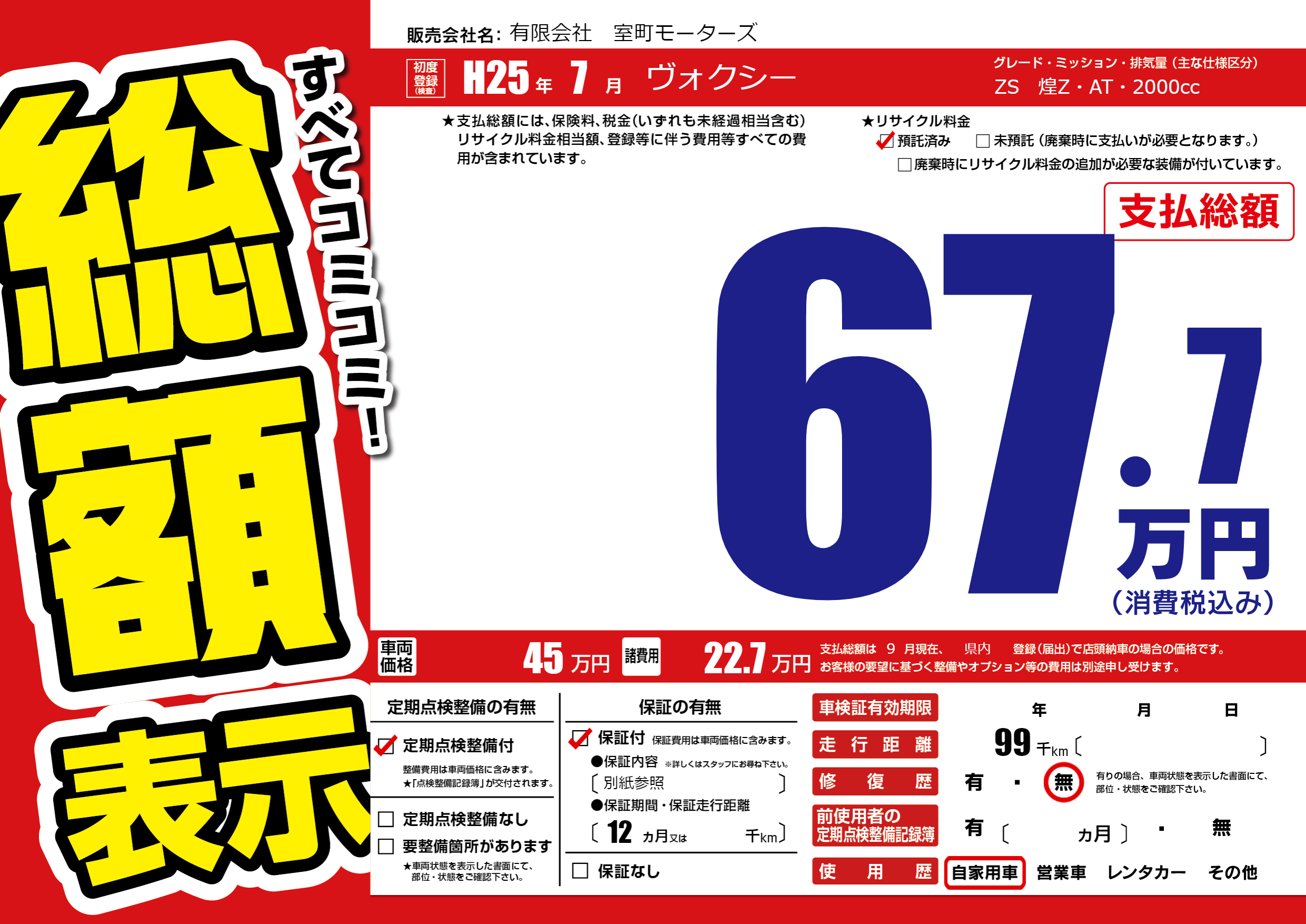 | 車名 | ヴォクシー | グレード ミッション 排気量 |