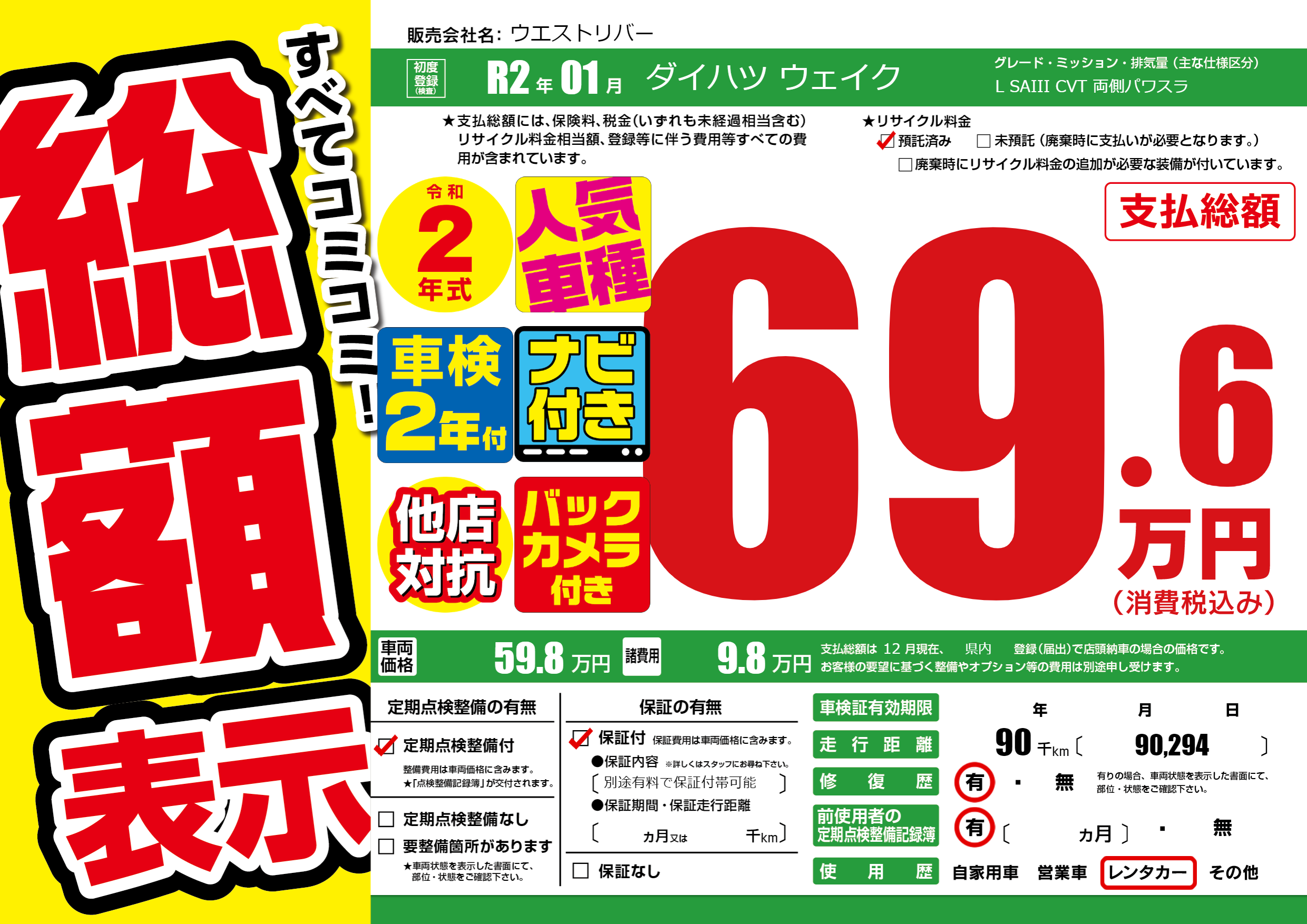 | 走行キロ | 9万km | 初年度登録 | R2年01月 |