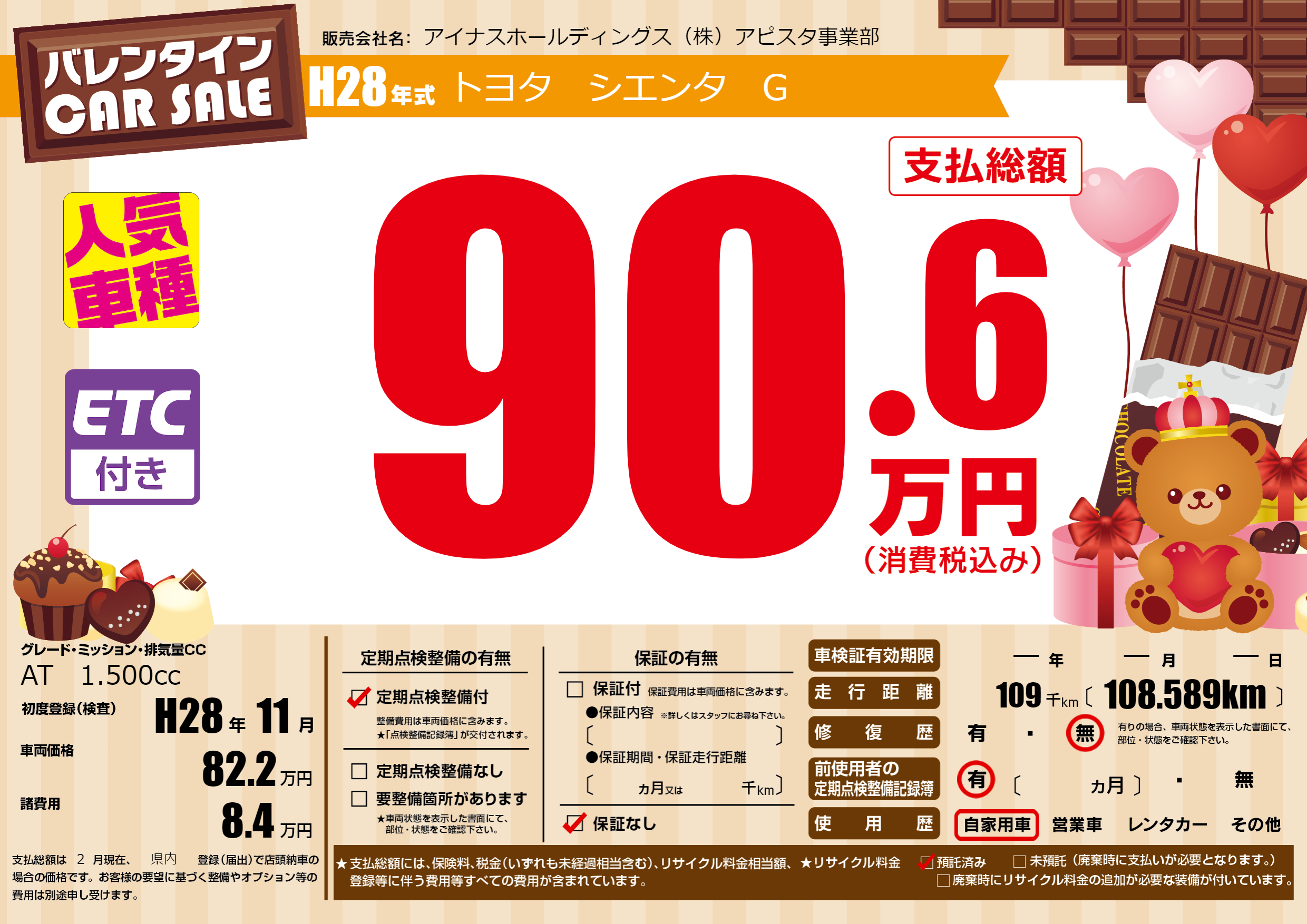 | 車名 | トヨタ シエンタ G | グレード ミッション 排気量 |