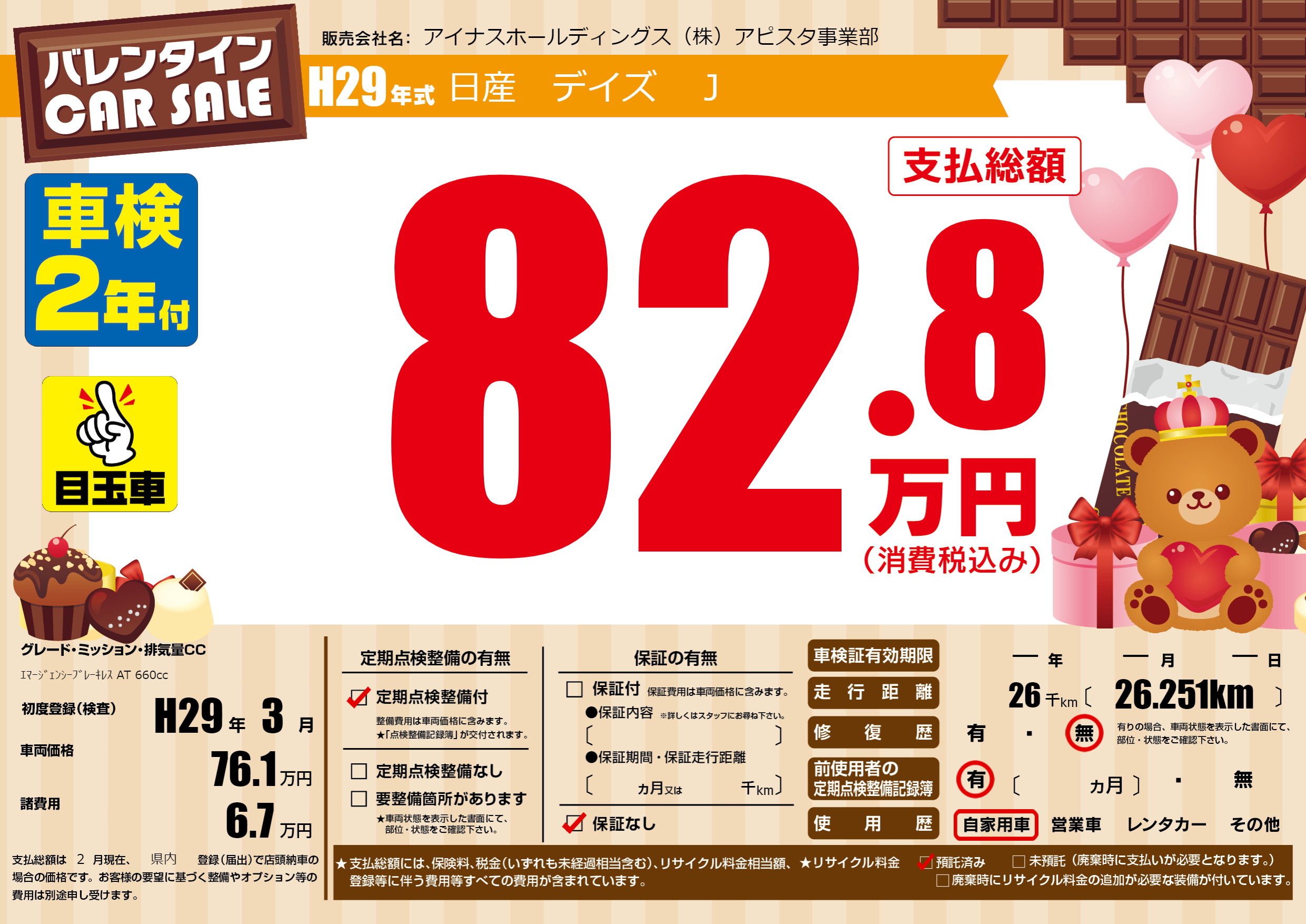 | 走行キロ | 2.6万km | 初年度登録 | H29年3月 |