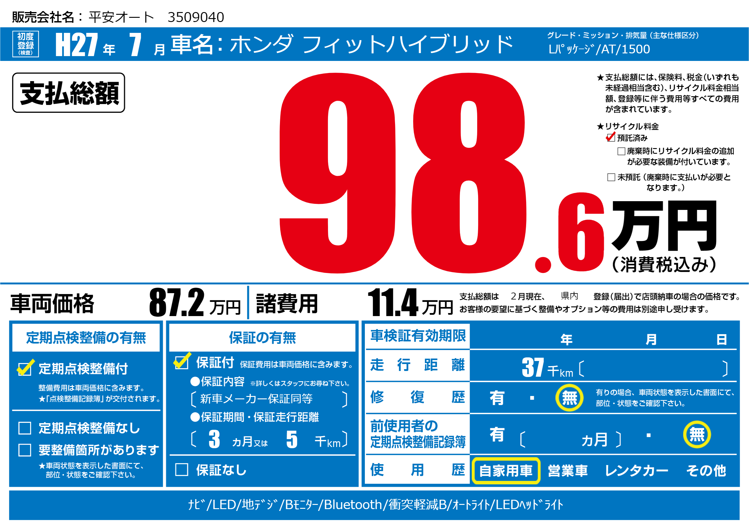 | 車名 | ホンダ フィットハイブリッド | グレード ミッション 排気量 |