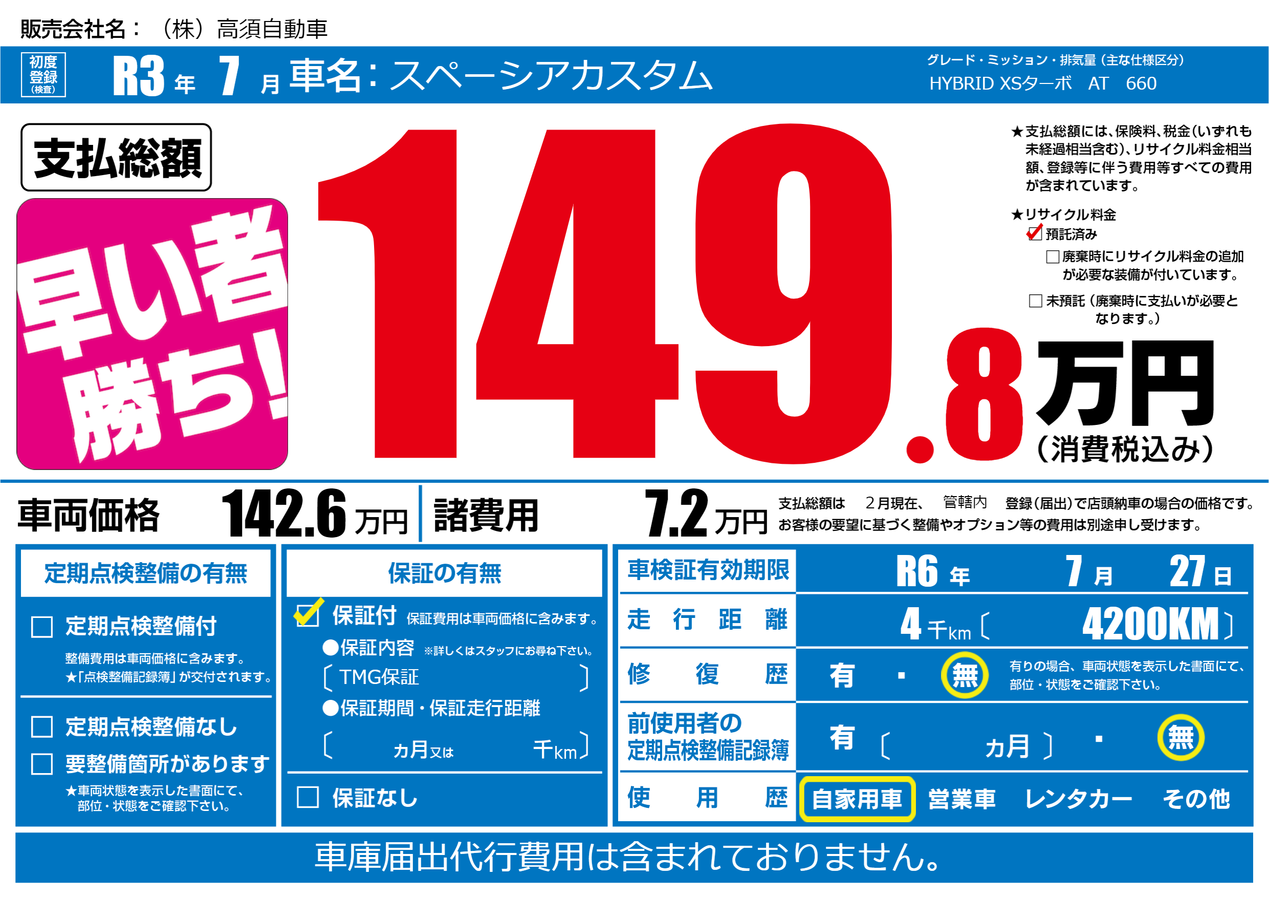 | 車名 | スペーシアカスタム | グレード ミッション 排気量 |