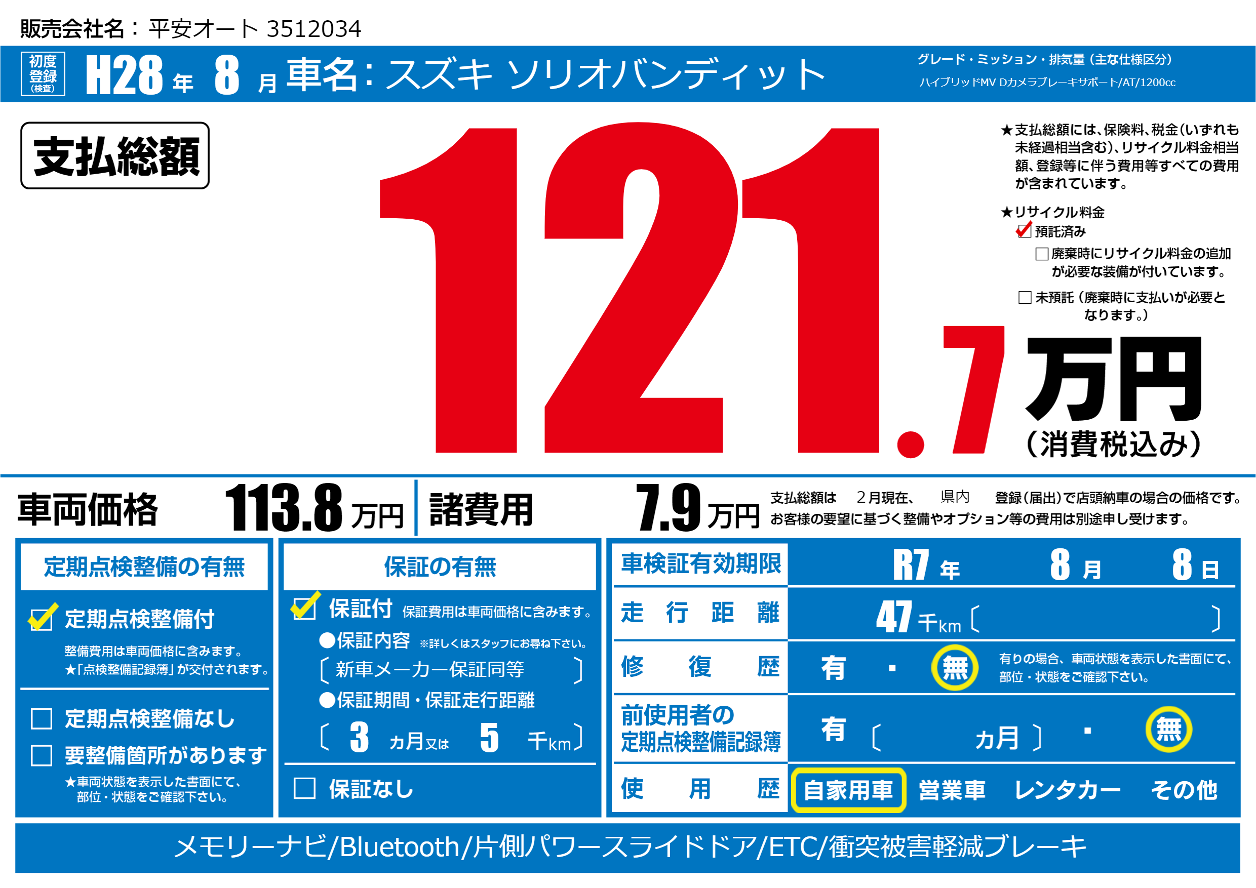 | 車検制限 | R7年 8月 8日 | ||