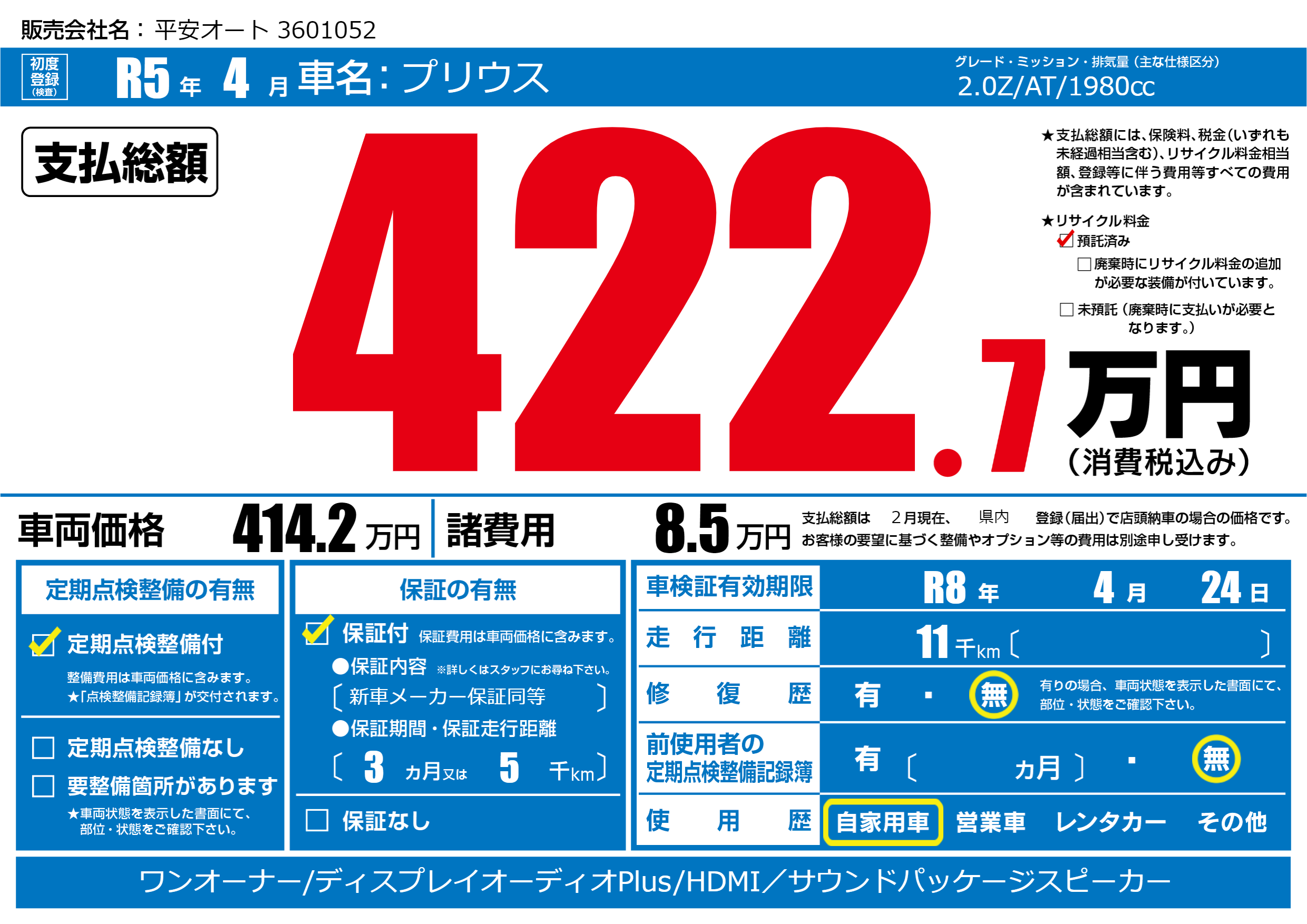| 車名 | プリウス | グレード ミッション 排気量 |