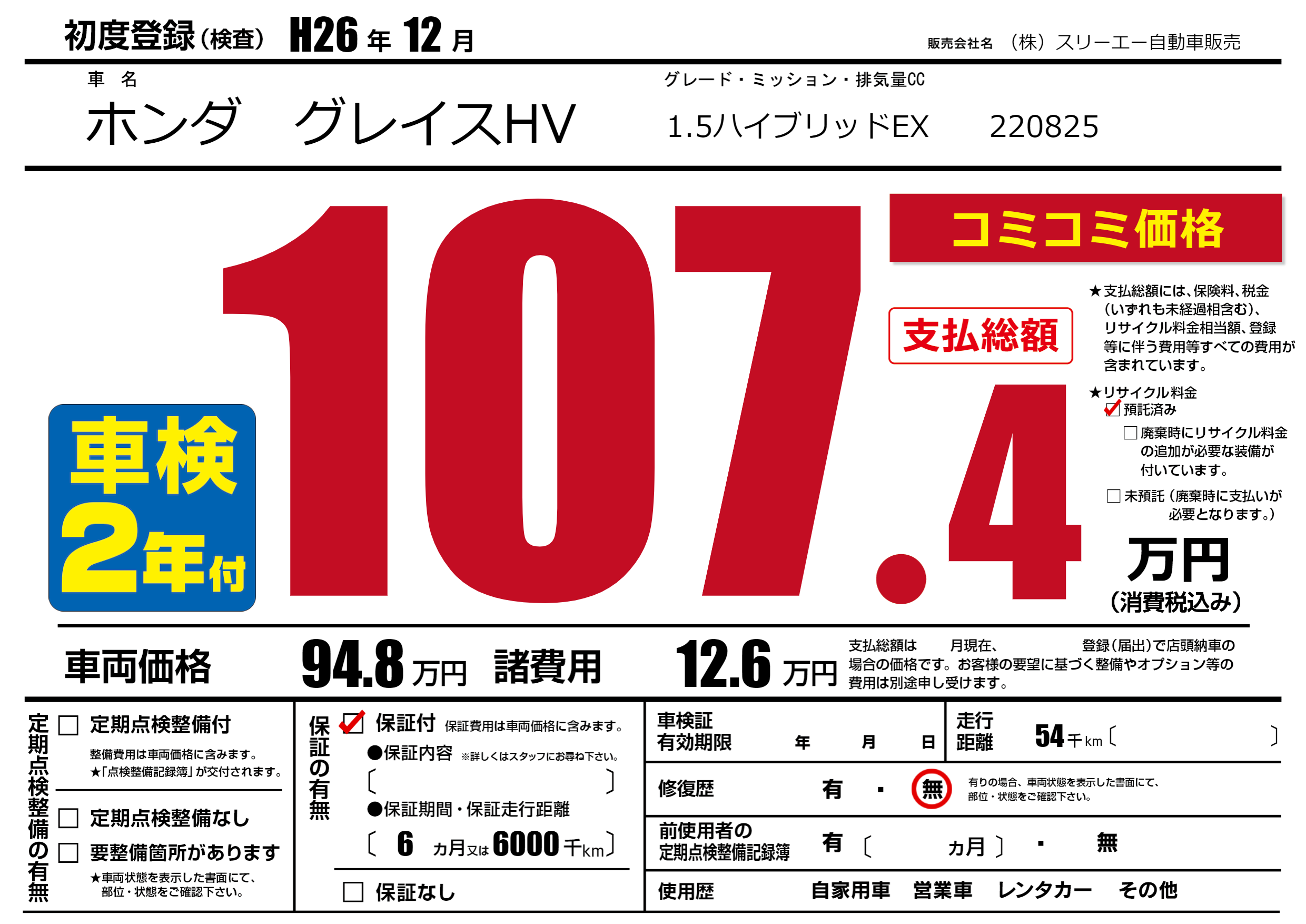 保証付き 保証内容(---) 6ヶ月または(6000)千kmまで |