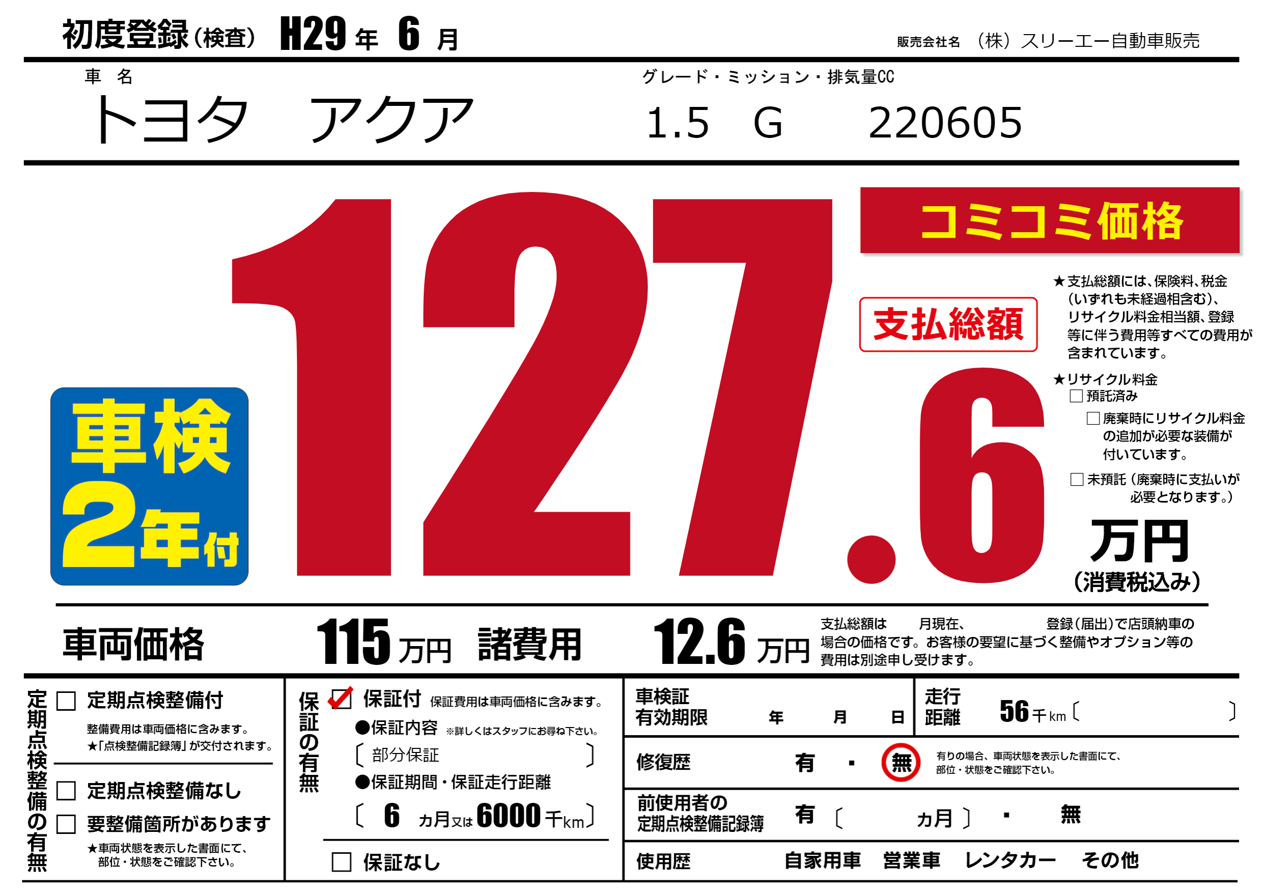 保証付き 保証内容(部分保証) 6ヶ月または(6000)千kmまで |