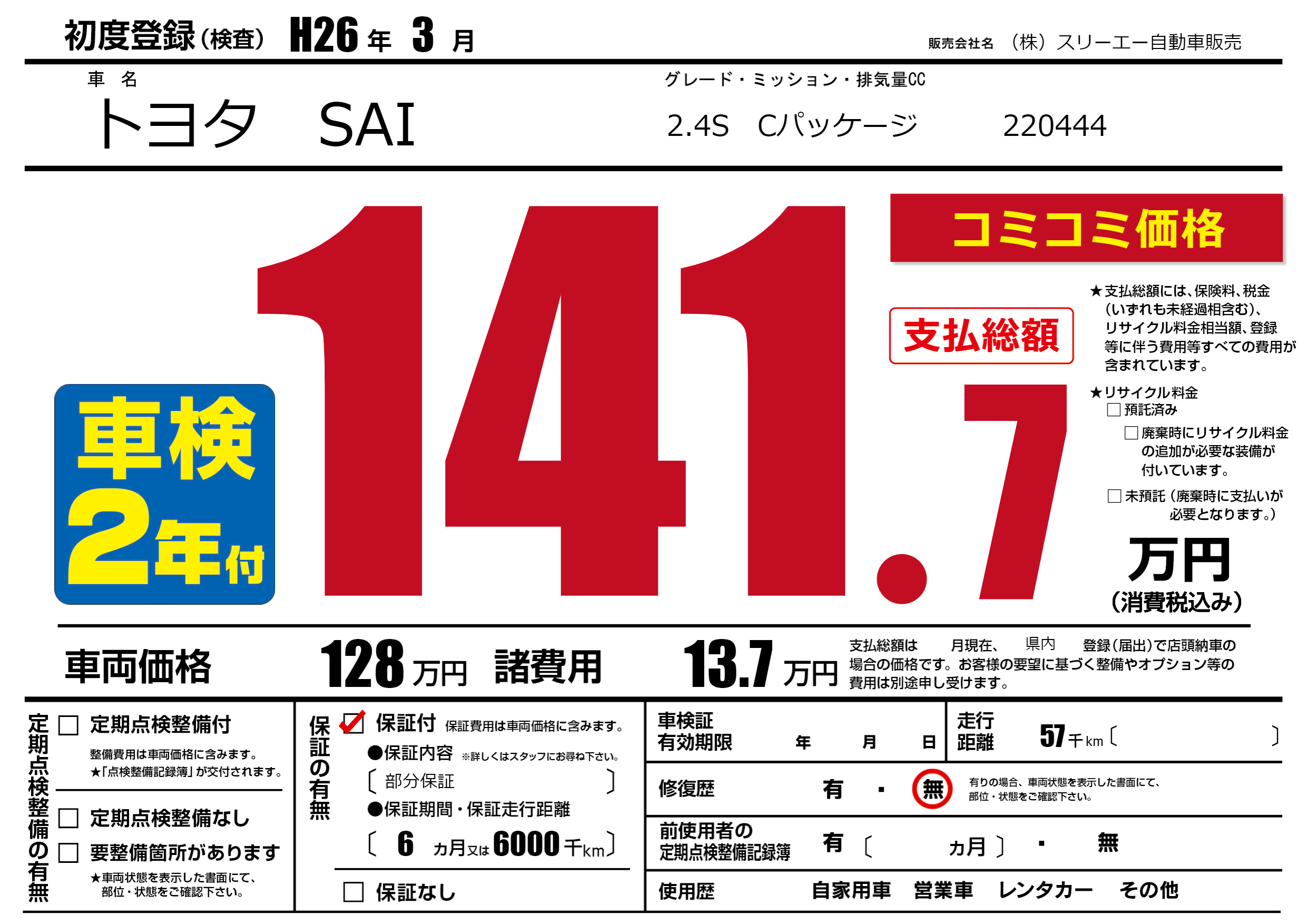 | 車名 | トヨタ SAI | グレード ミッション 排気量 |