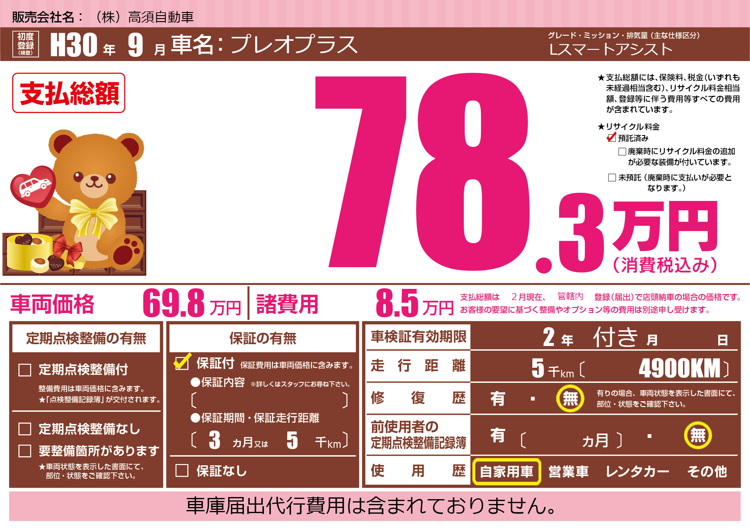 | 走行キロ | 0.5万km | 初年度登録 | H30年9月 |