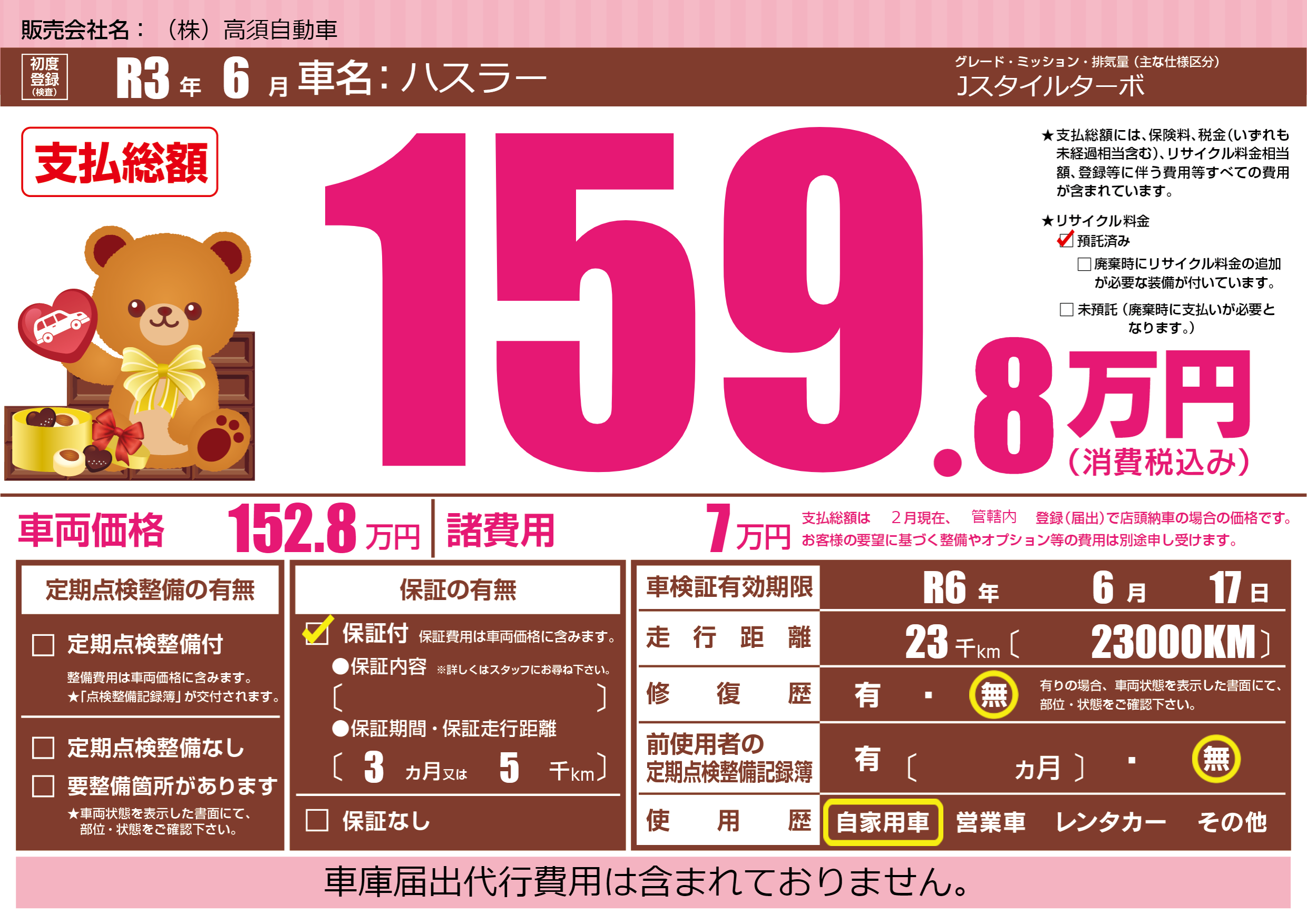 | 走行キロ | 2.3万km | 初年度登録 | R3年6月 |