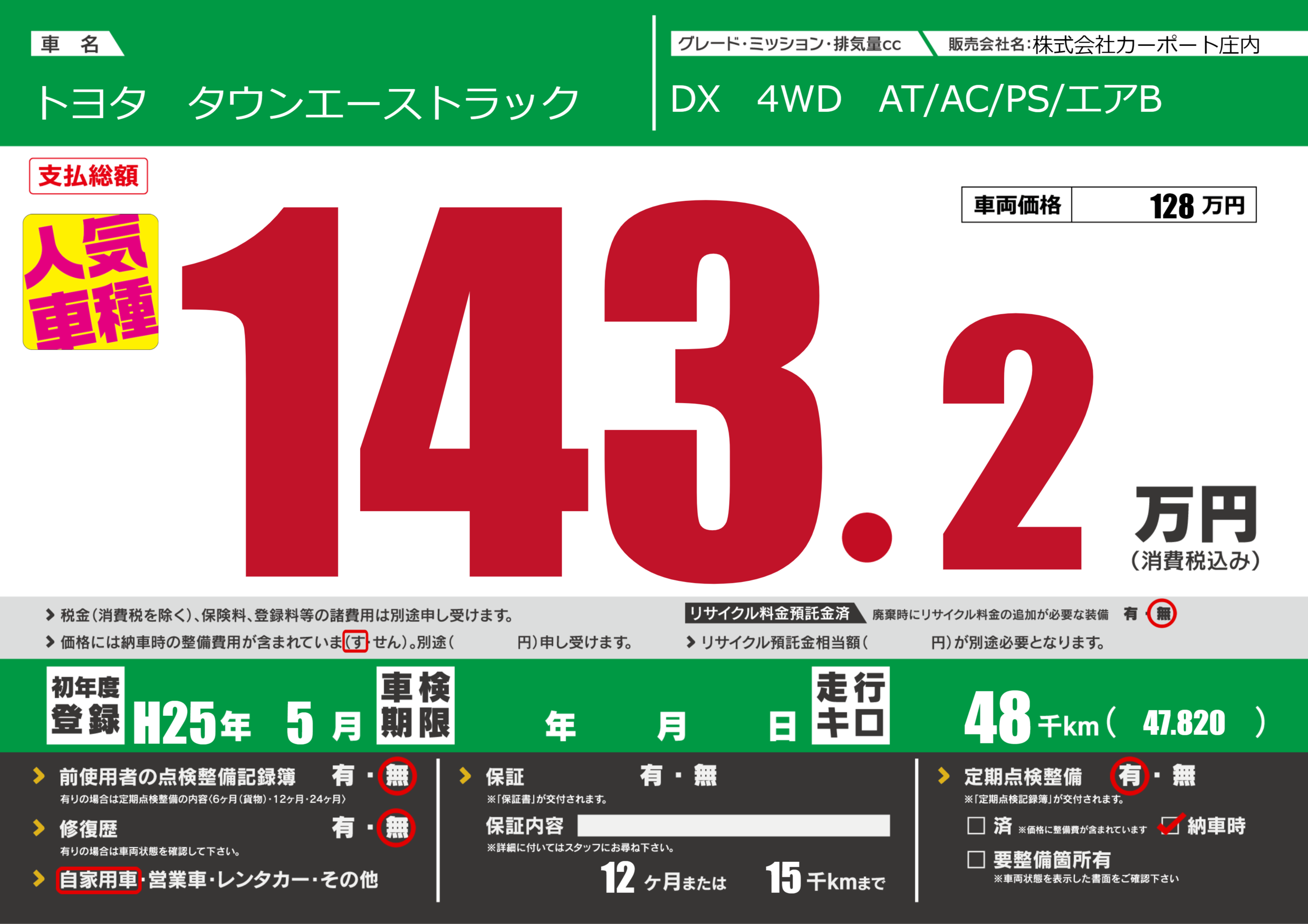 | 定期点検整備 | 定期点検整備あり 納車時あり | ||