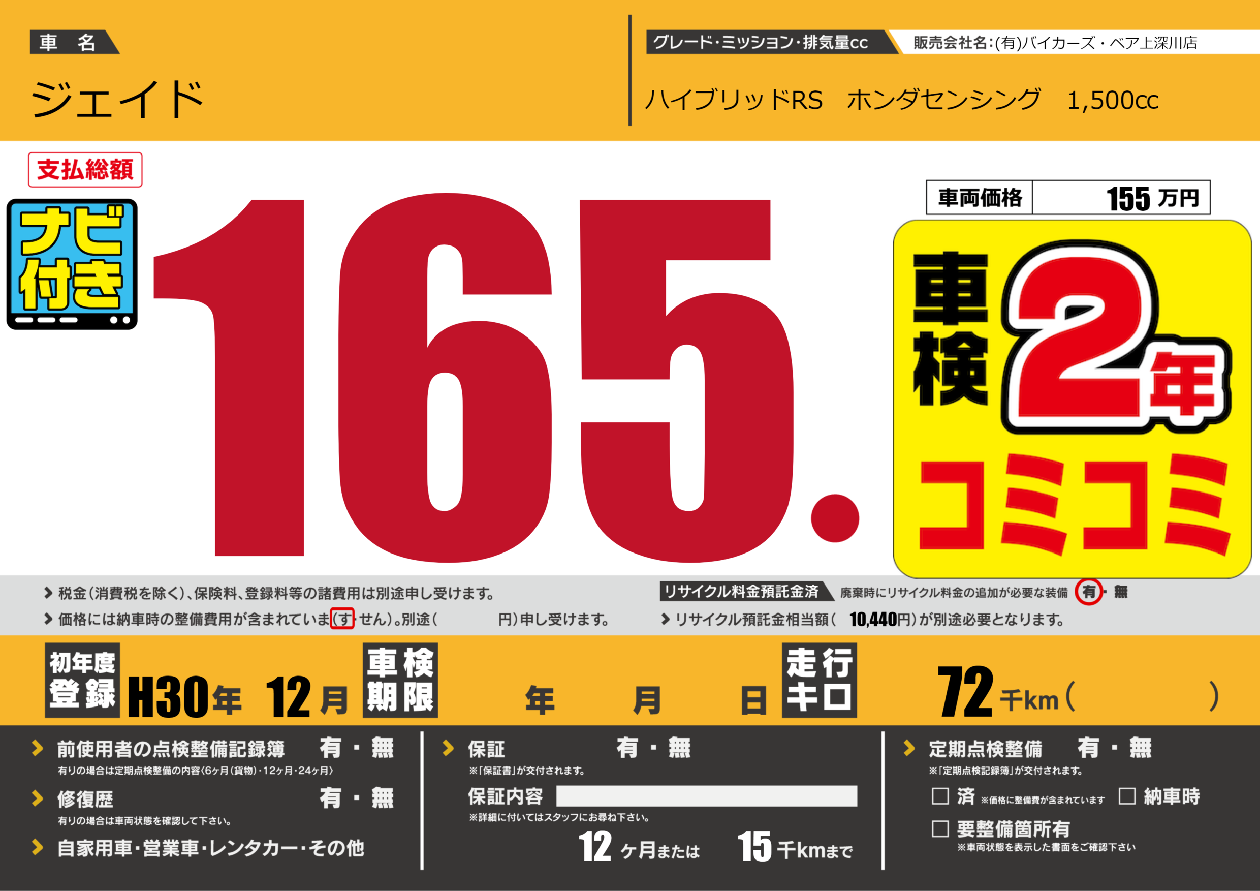 | 走行キロ | 7.2万km | 初年度登録 | H30年12月 |