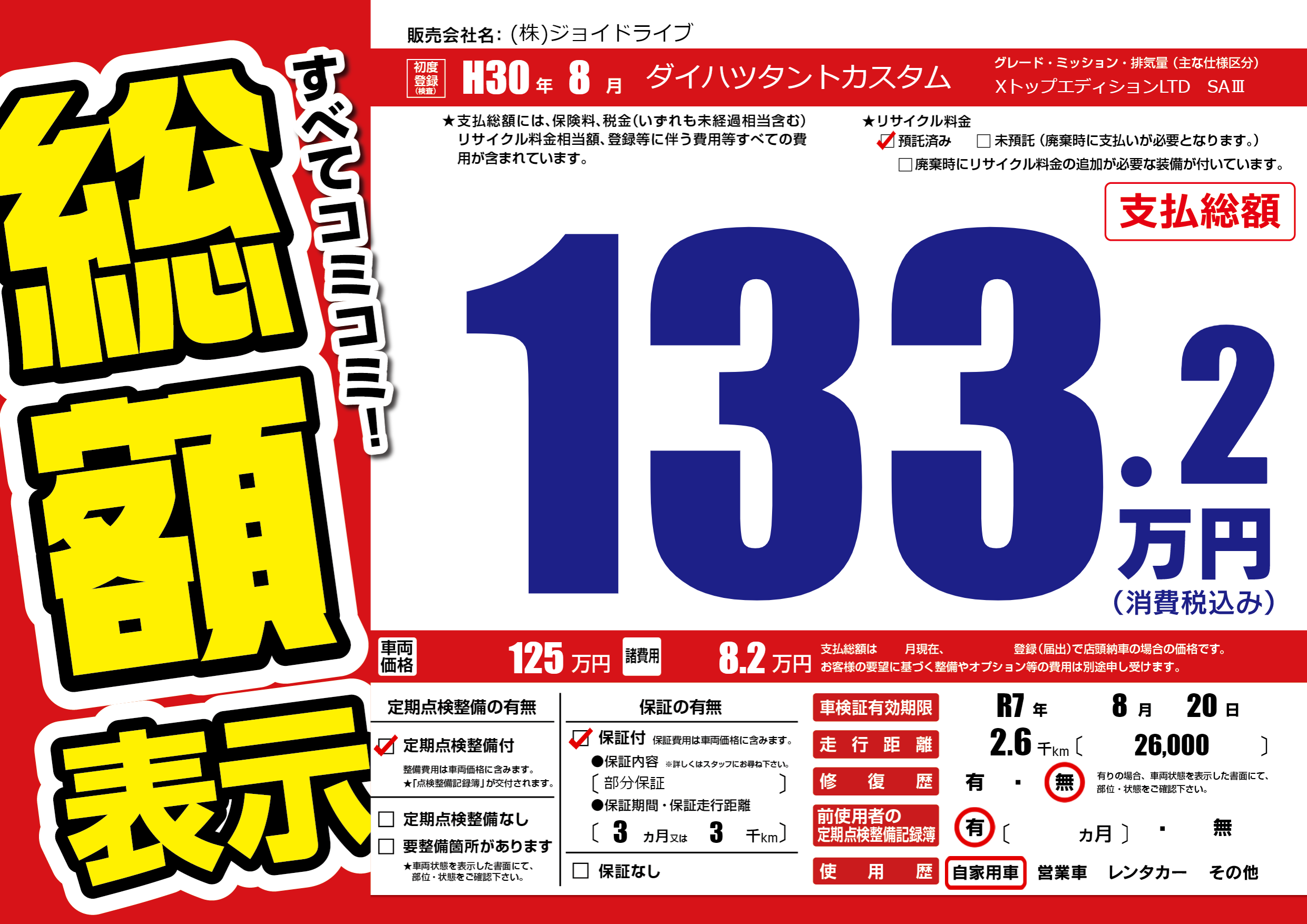 | 車名 | ダイハツタントカスタム | グレード ミッション 排気量 |
