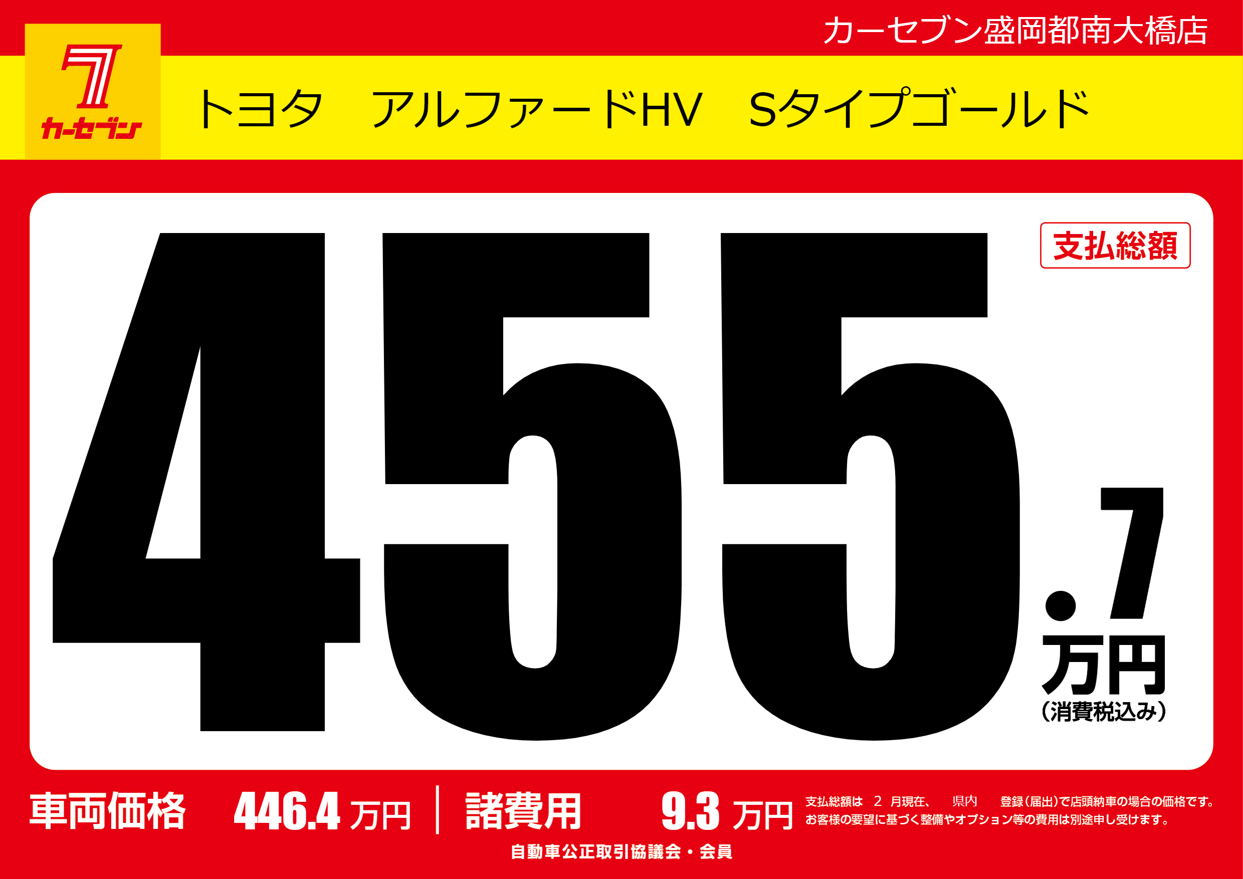 | 車名 | トヨタ アルファードHV Sタイプゴールド | グレード ミッション 排気量 |