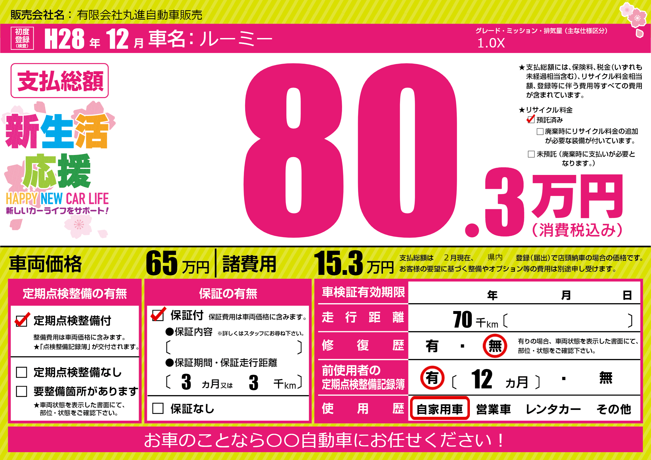 | 車名 | ルーミー | グレード ミッション 排気量 |