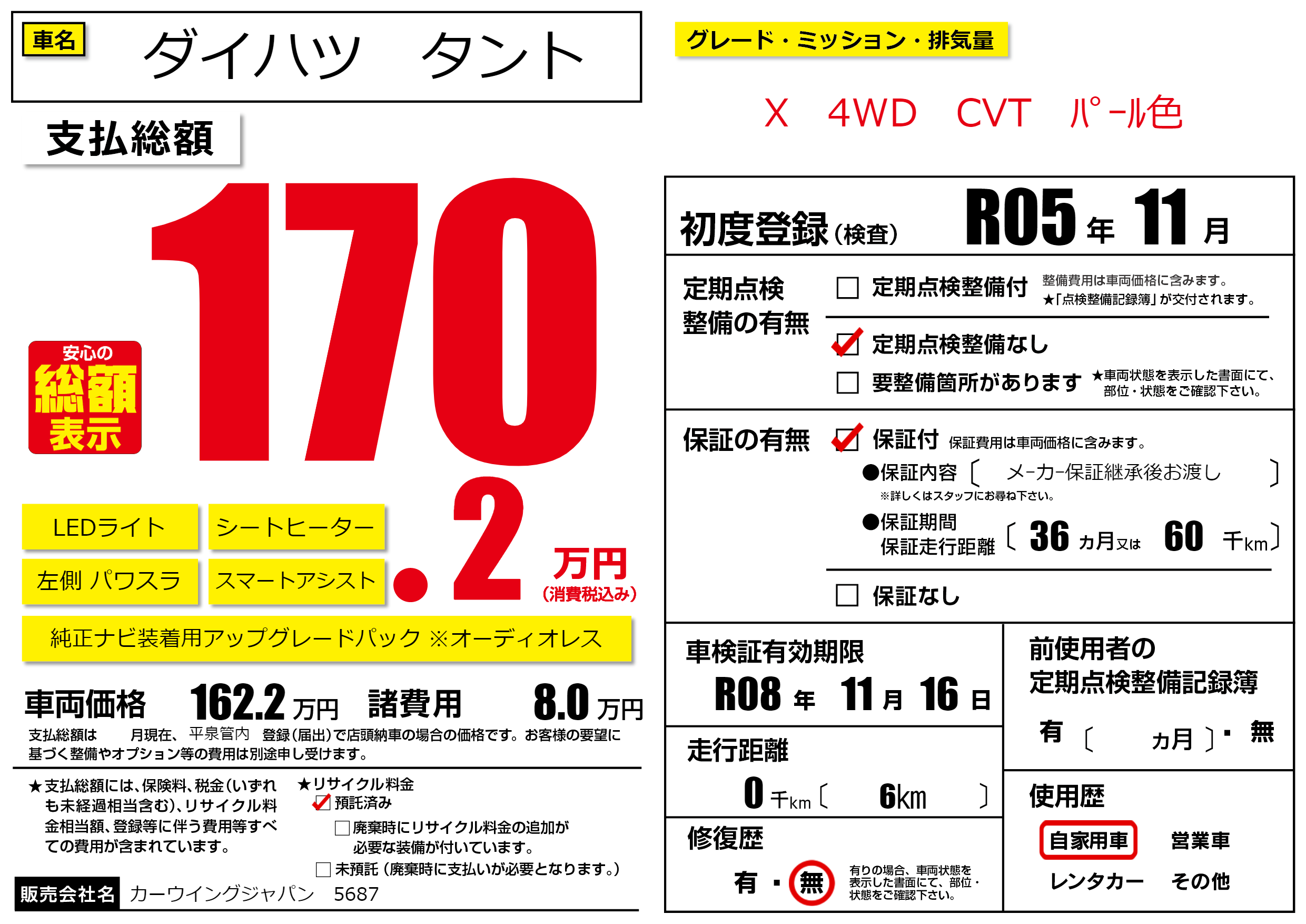 | 車名 | ダイハツ タント | グレード ミッション 排気量 |