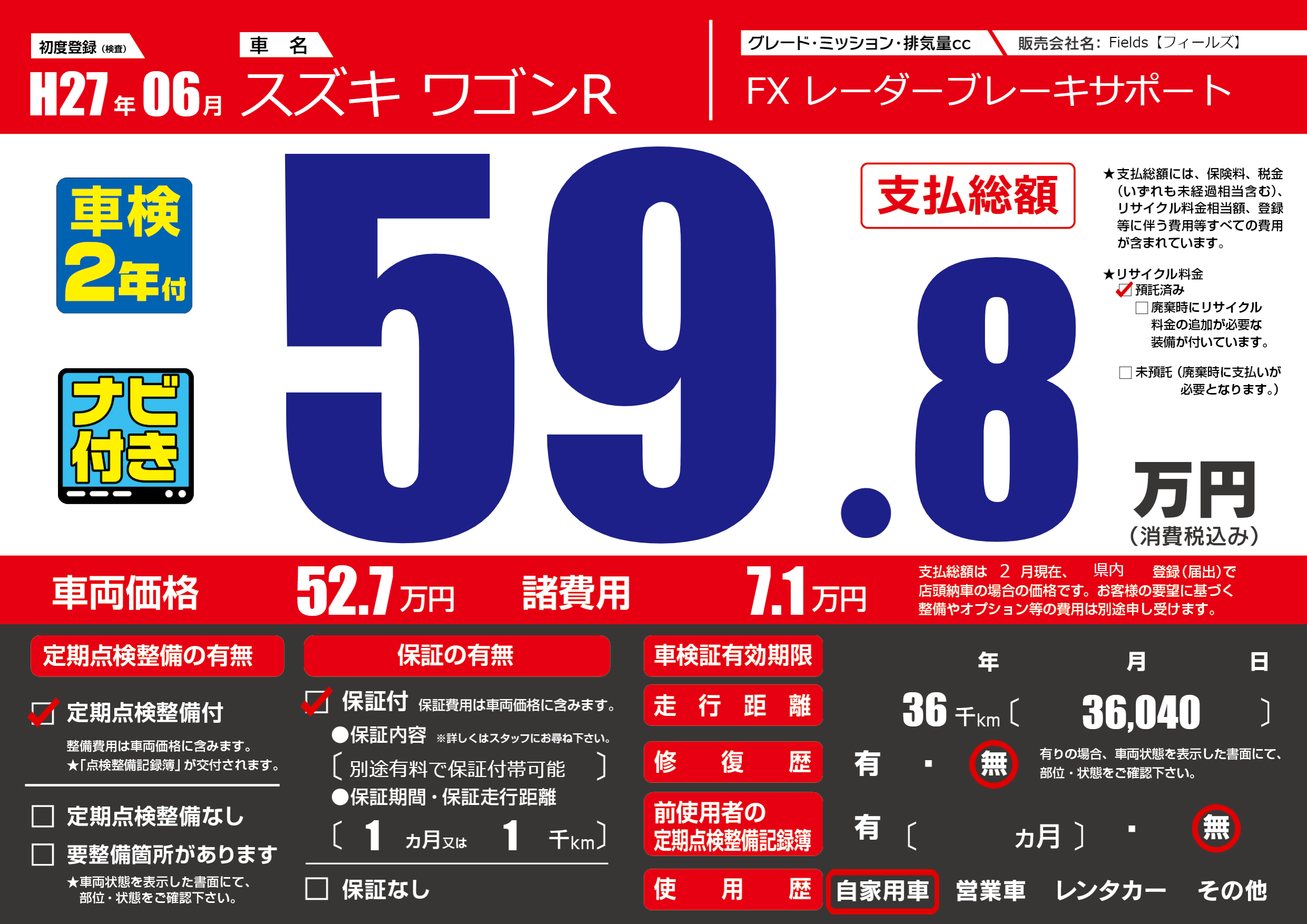 | 走行キロ | 3.6万km | 初年度登録 | H27年06月 |