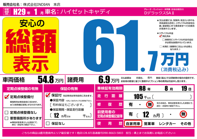 | 走行キロ | 1万km | 初年度登録 | H23年3月 |