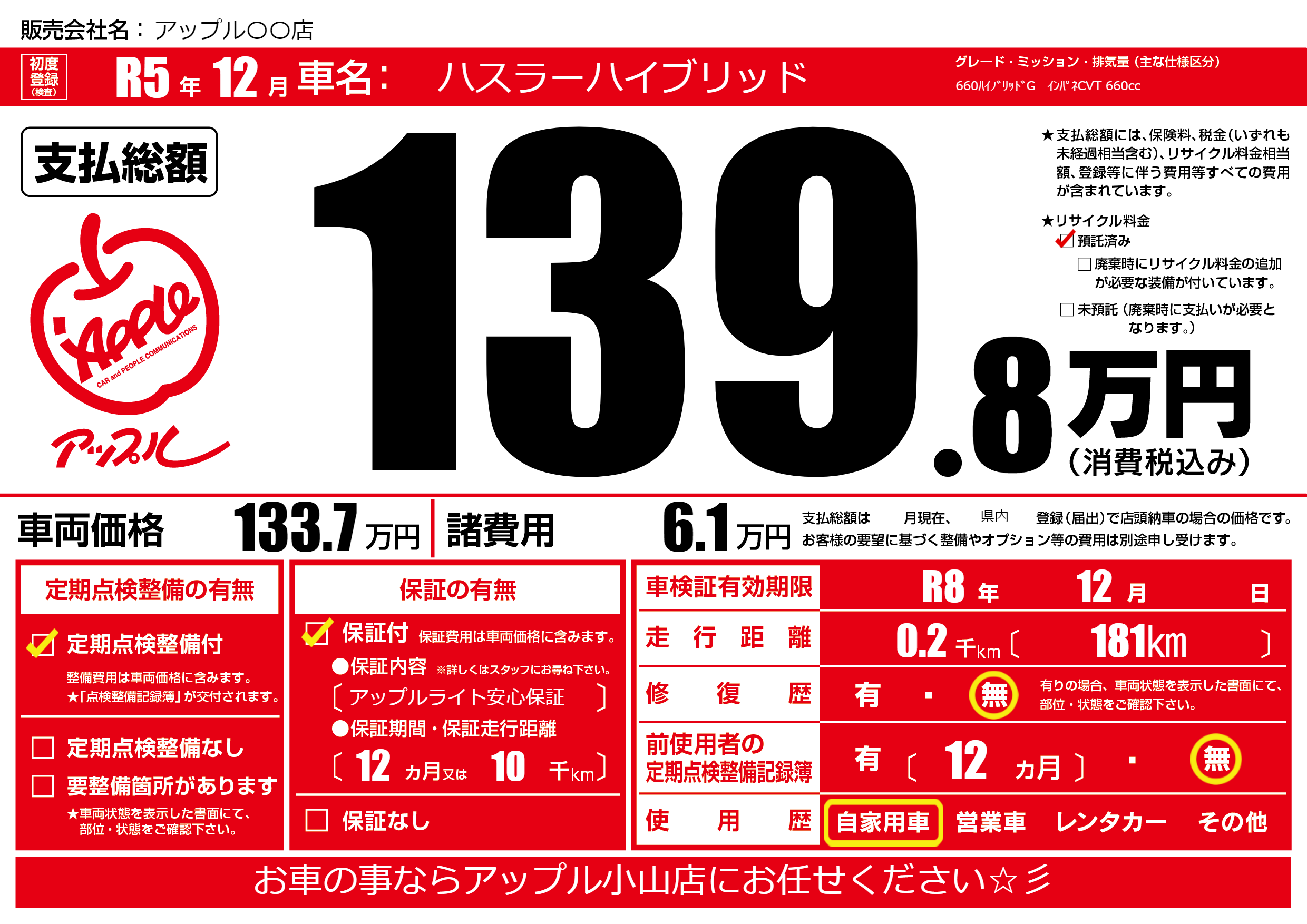 保証付き 保証内容(アップルライト安心保証) 12ヶ月または(10)千kmまで |