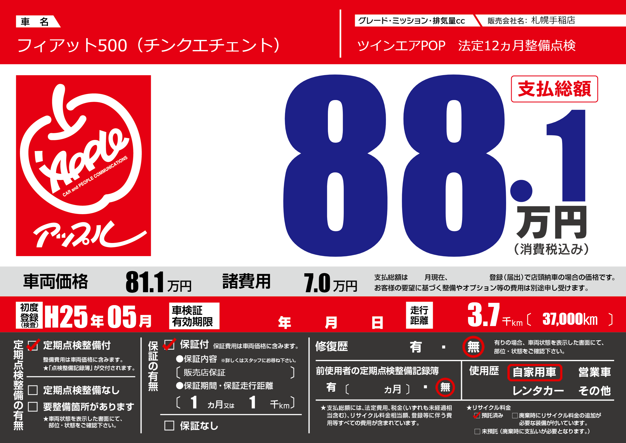 | 車名 | フィアット500(チンクエチェント) | グレード ミッション 排気量 |