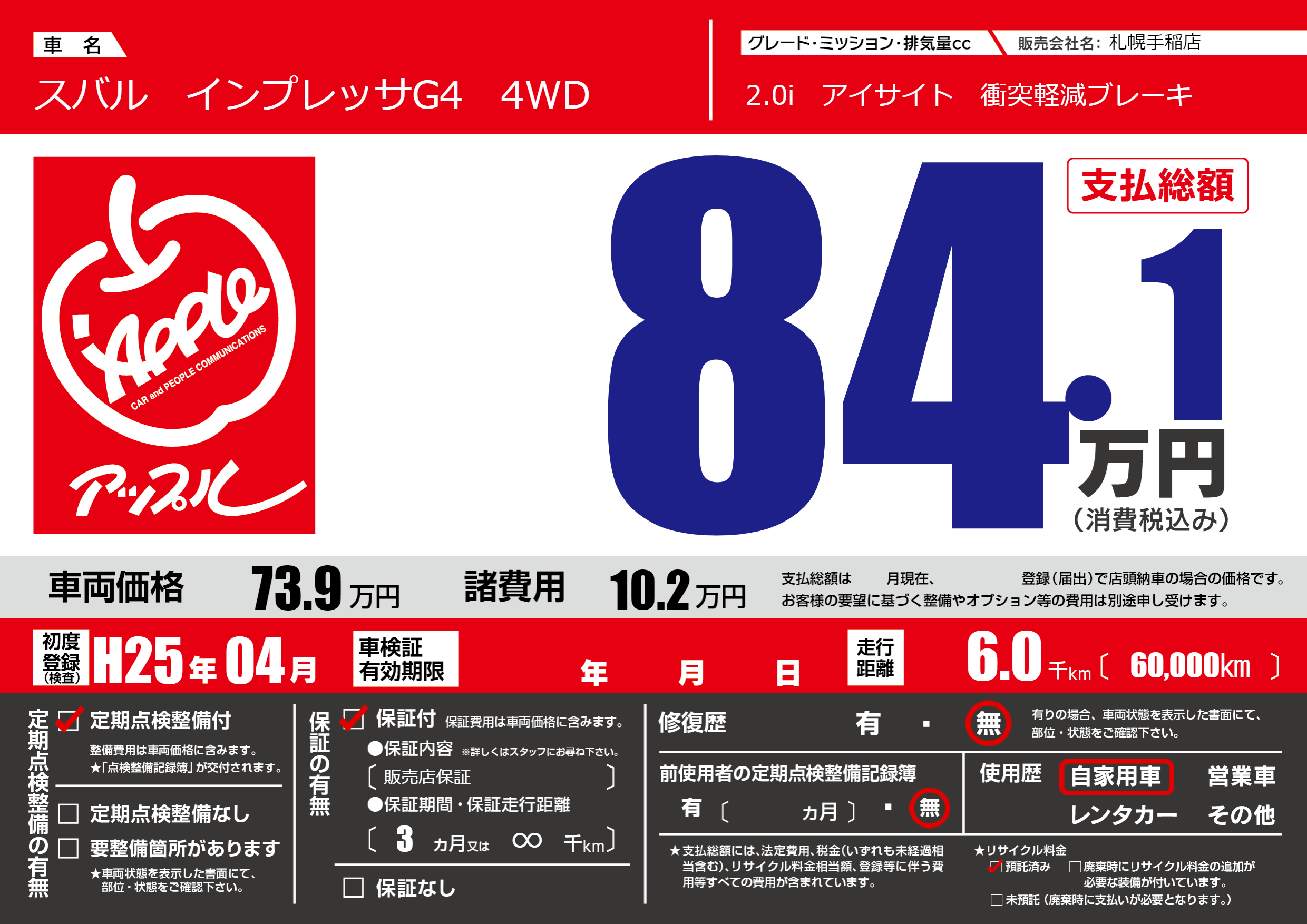 | 車名 | スバル インプレッサG4 4WD | グレード ミッション 排気量 |