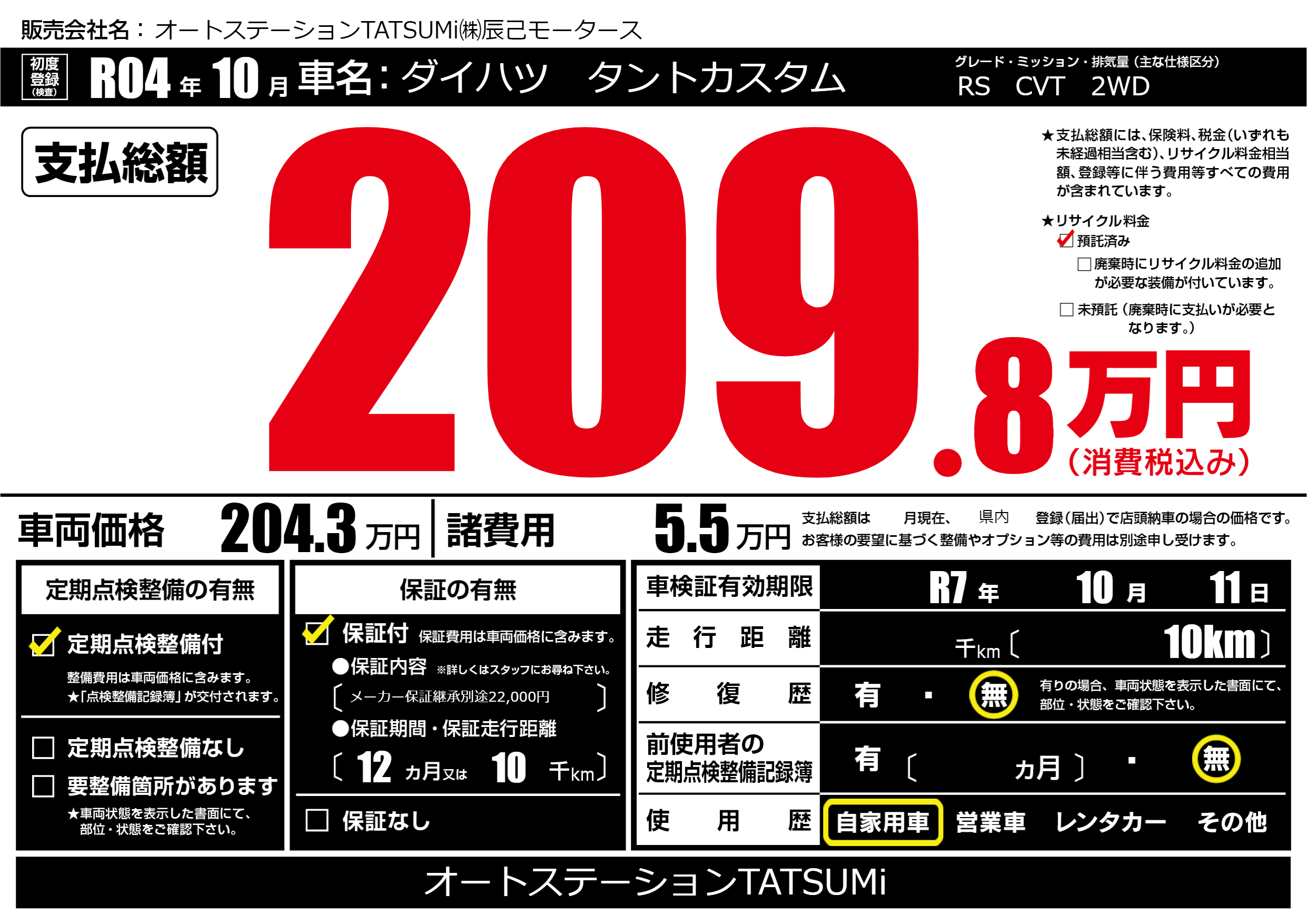 | 車名 | ダイハツ タントカスタム | グレード ミッション 排気量 |