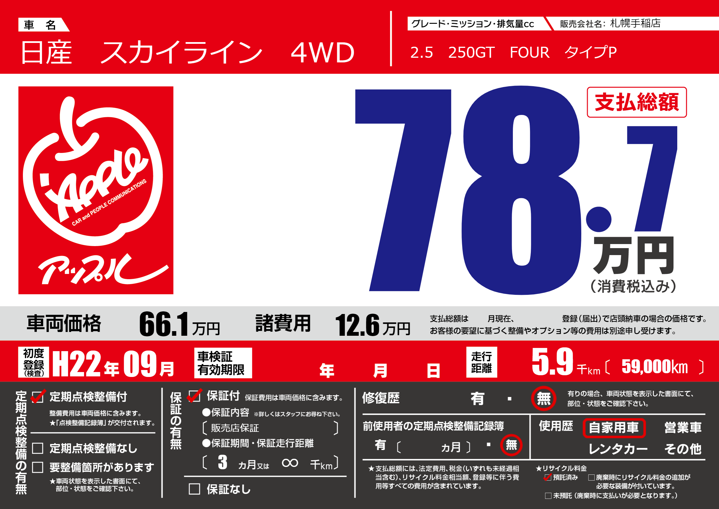 | 車名 | 日産 スカイライン 4WD | グレード ミッション 排気量 |