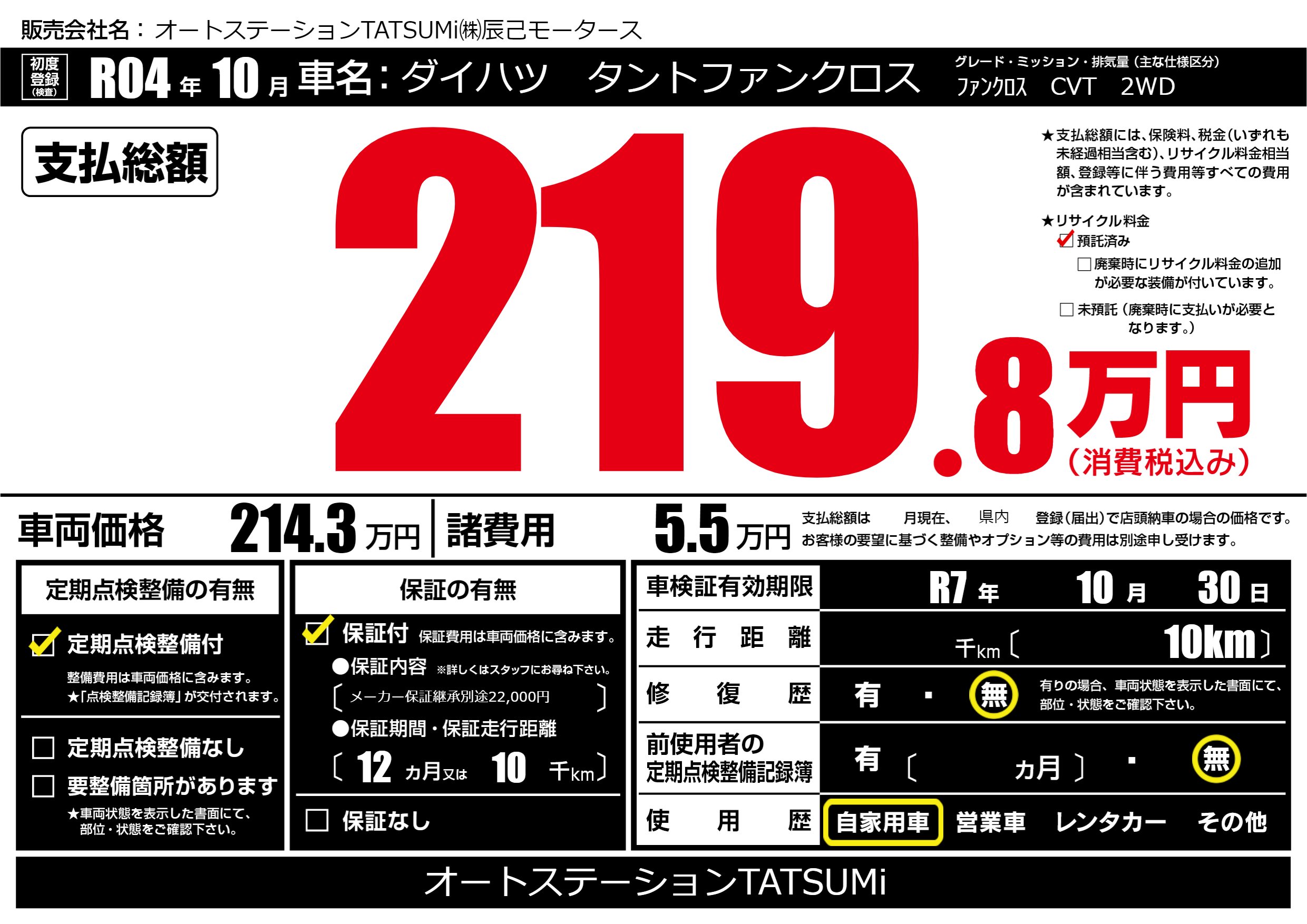 | 車名 | ダイハツ タントファンクロス | グレード ミッション 排気量 |