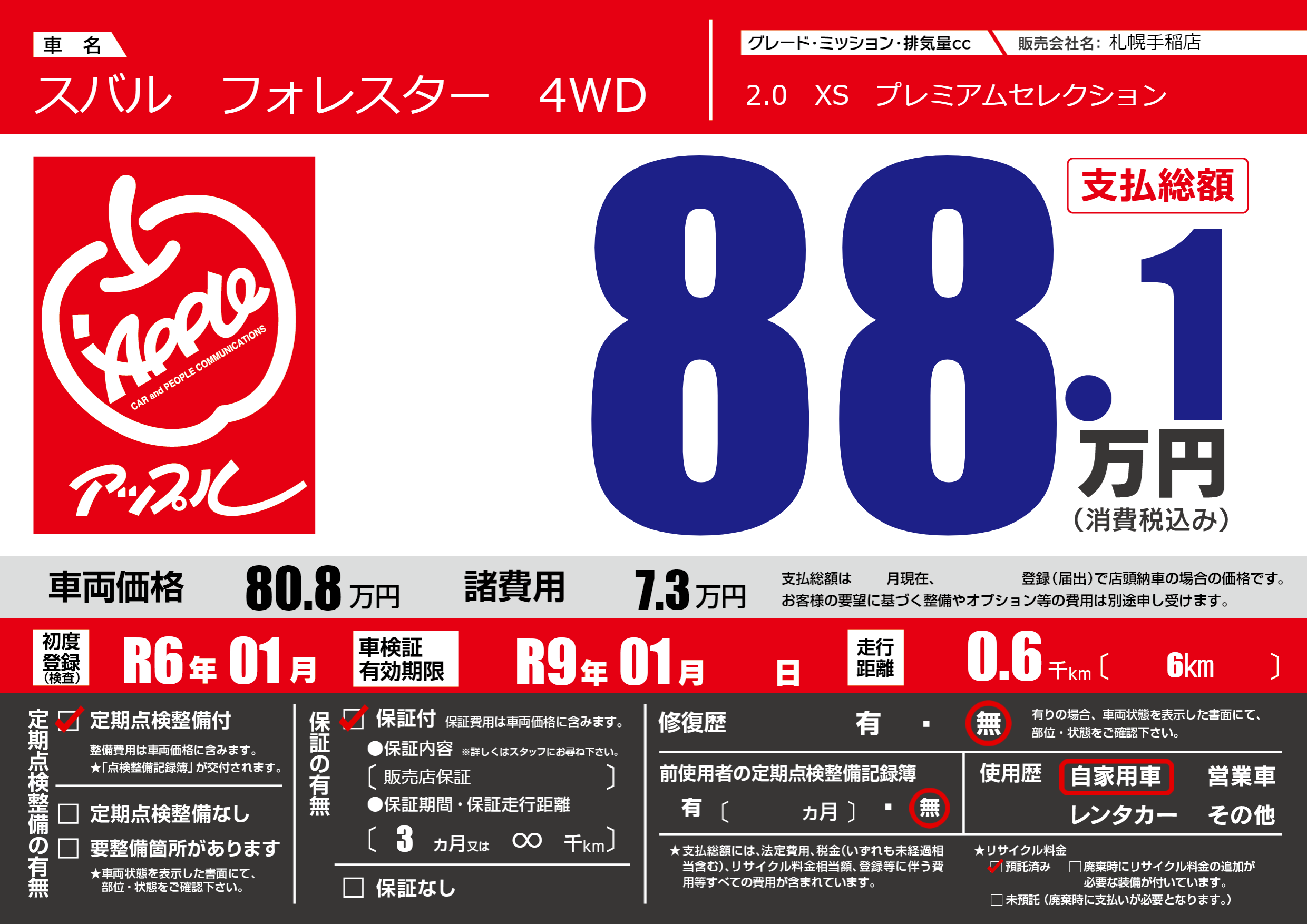 | 車名 | スバル フォレスター 4WD | グレード ミッション 排気量 |