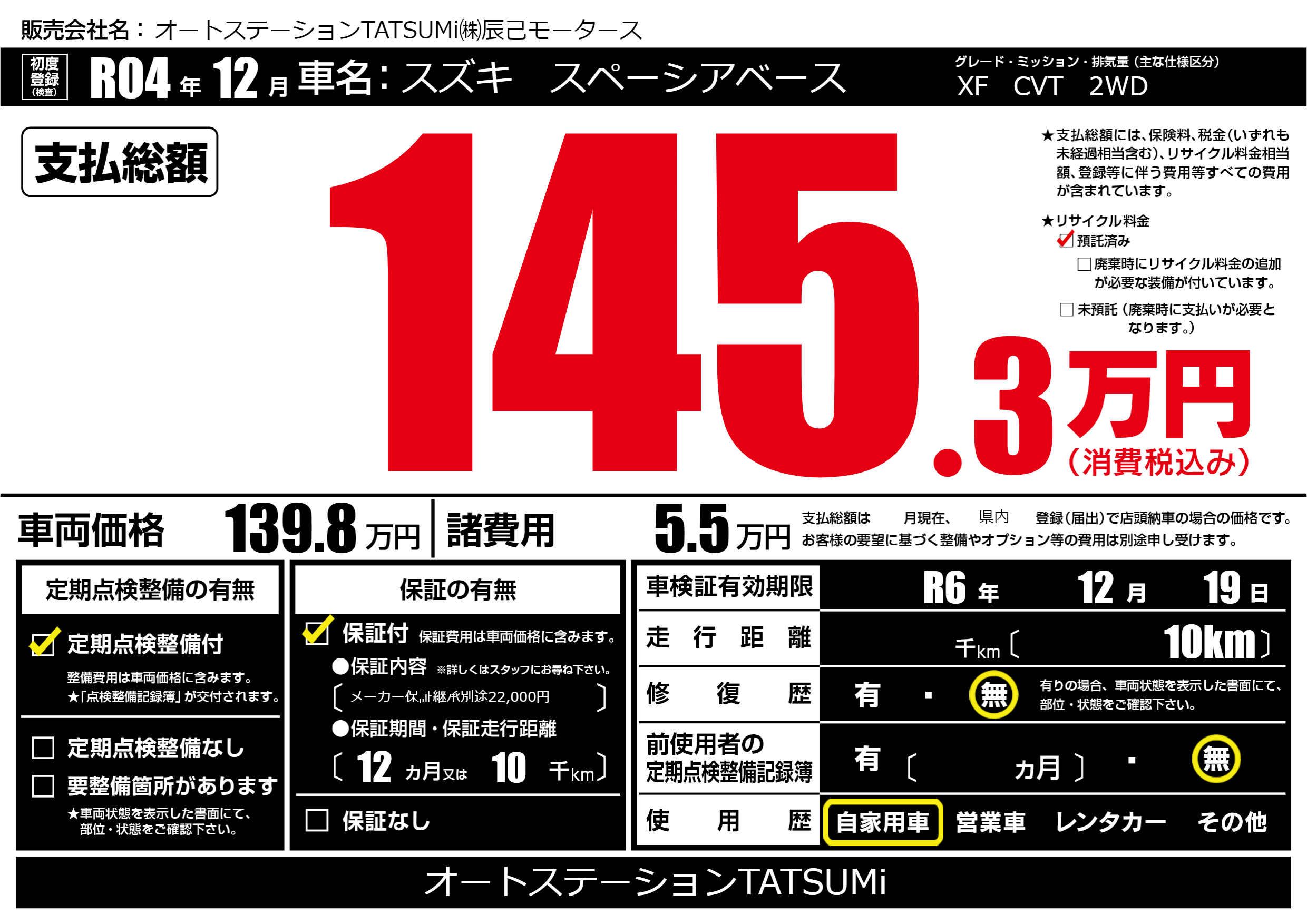 | 車検制限 | R6年 12月 19日 | ||