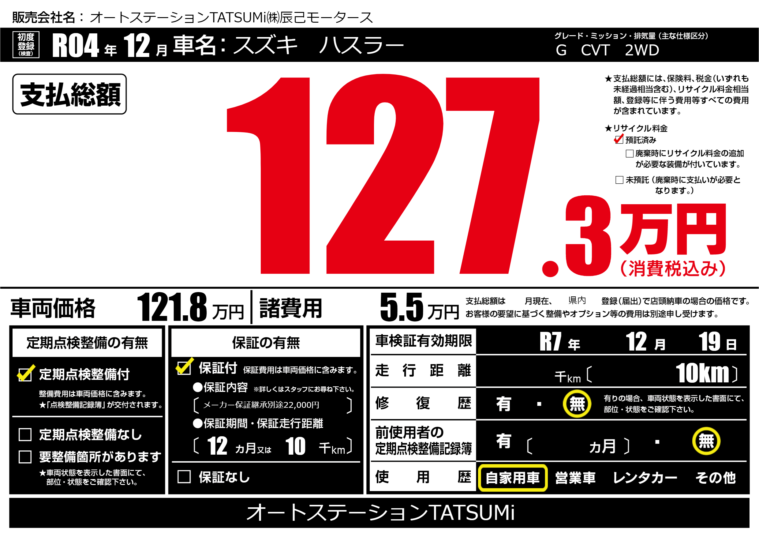 | 車名 | スズキ ハスラー | グレード ミッション 排気量 |