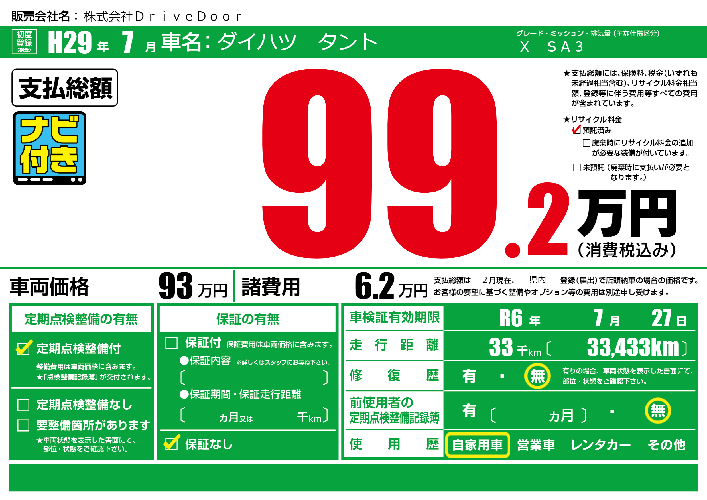 | 走行キロ | 3.3万km | 初年度登録 | H29年7月 |