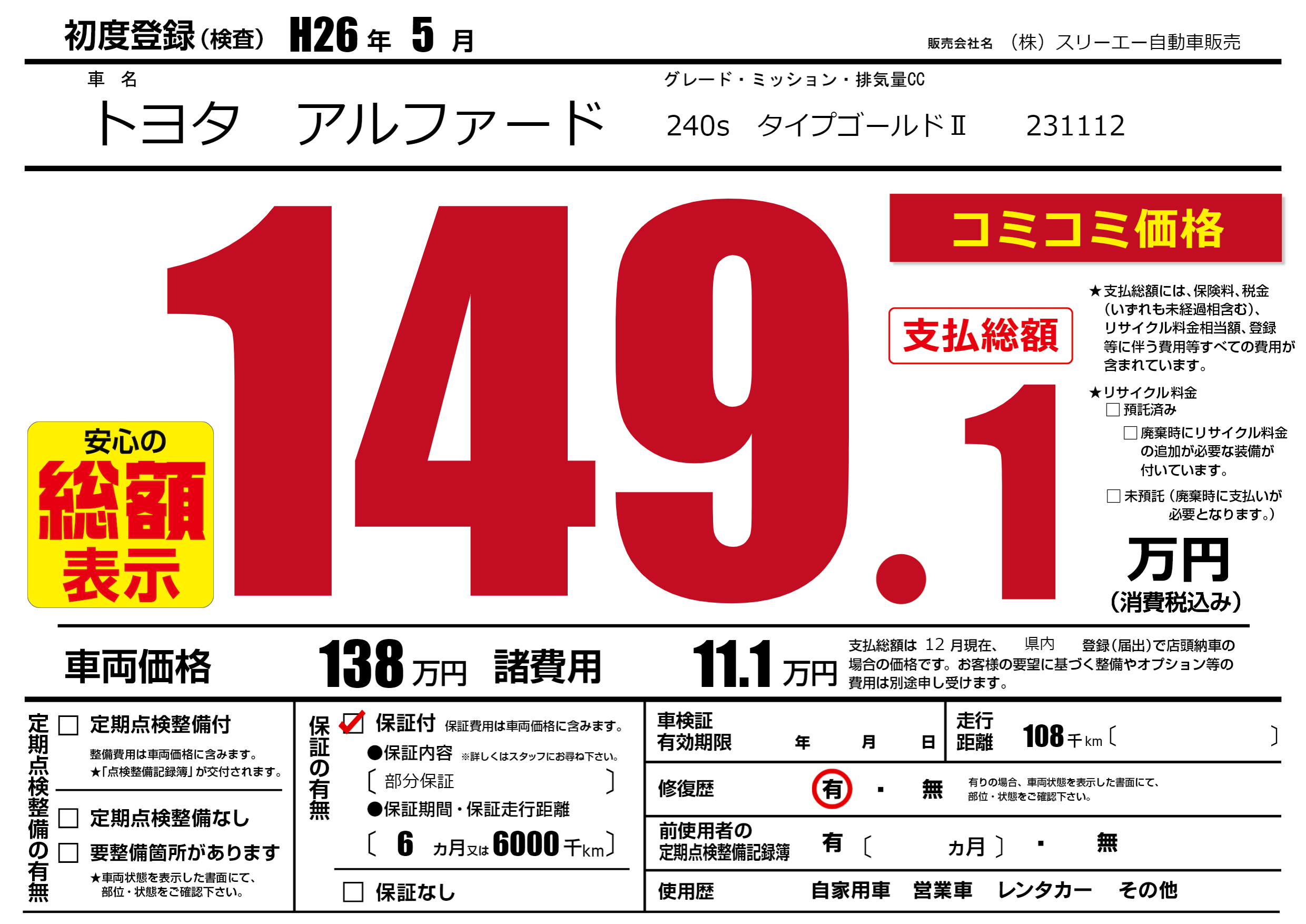 | 車名 | トヨタ アルファード | グレード ミッション 排気量 |
