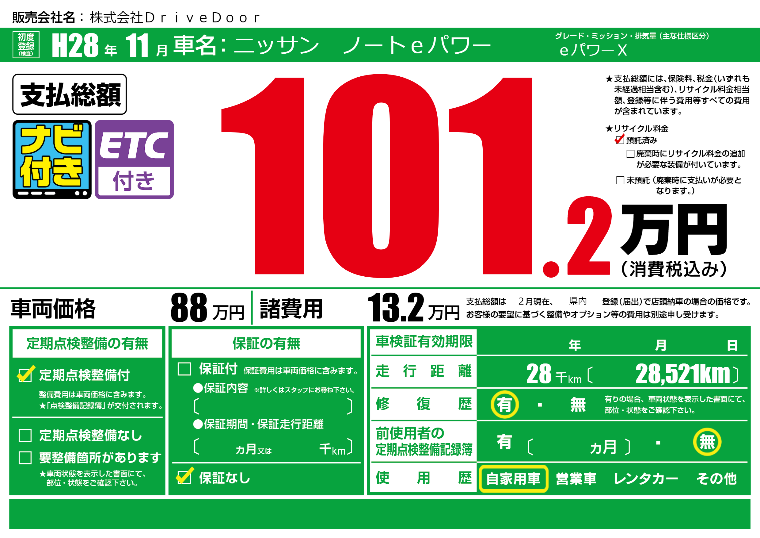 | 車名 | ニッサン ノートeパワー | グレード ミッション 排気量 |