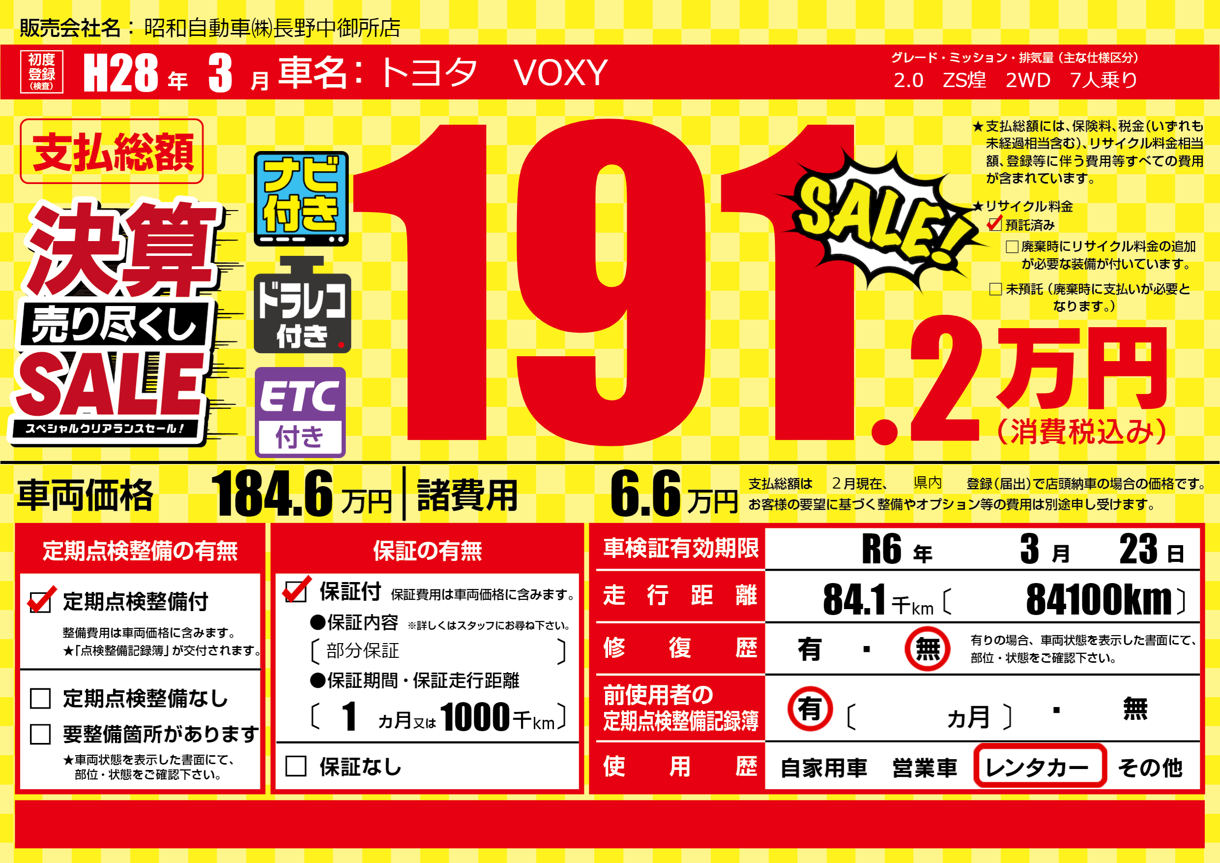 | 車名 | トヨタ VOXY | グレード ミッション 排気量 |
