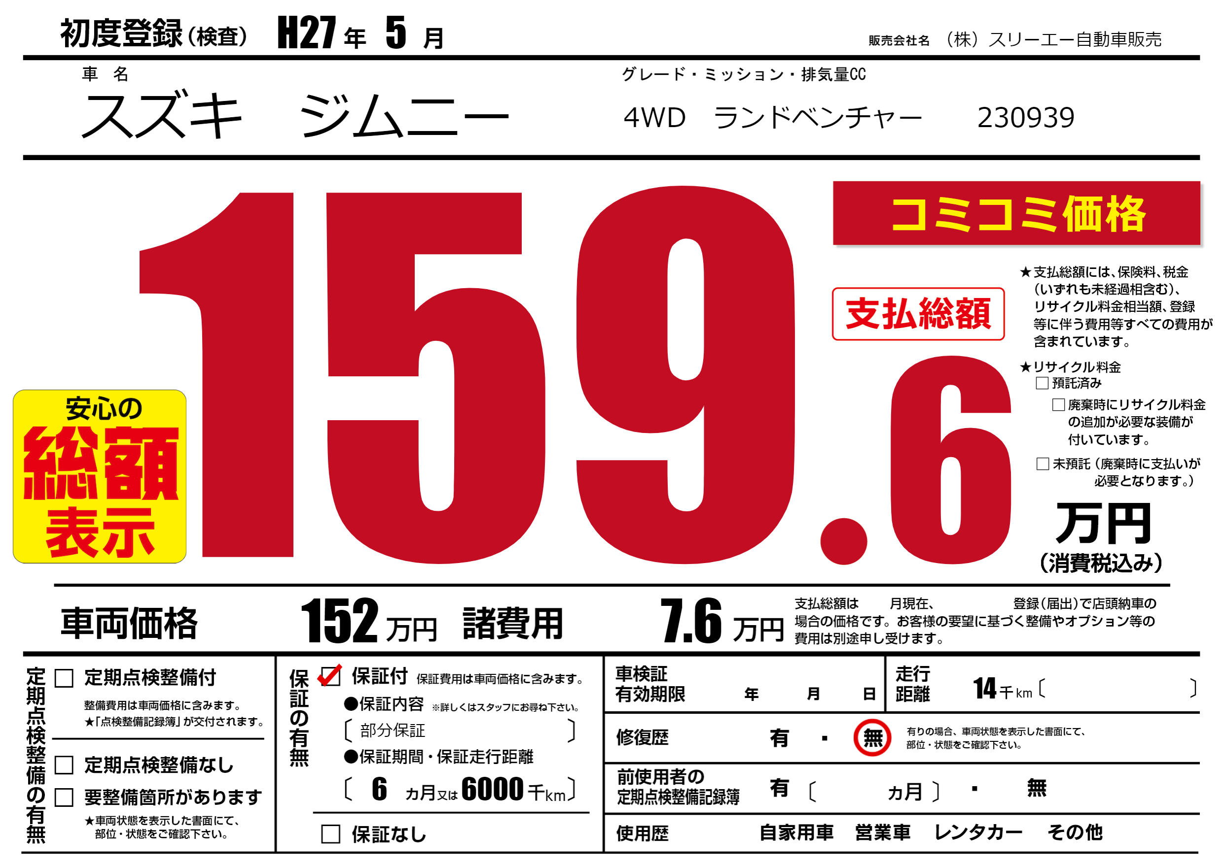 保証付き 保証内容(部分保証) 6ヶ月または(6000)千kmまで |