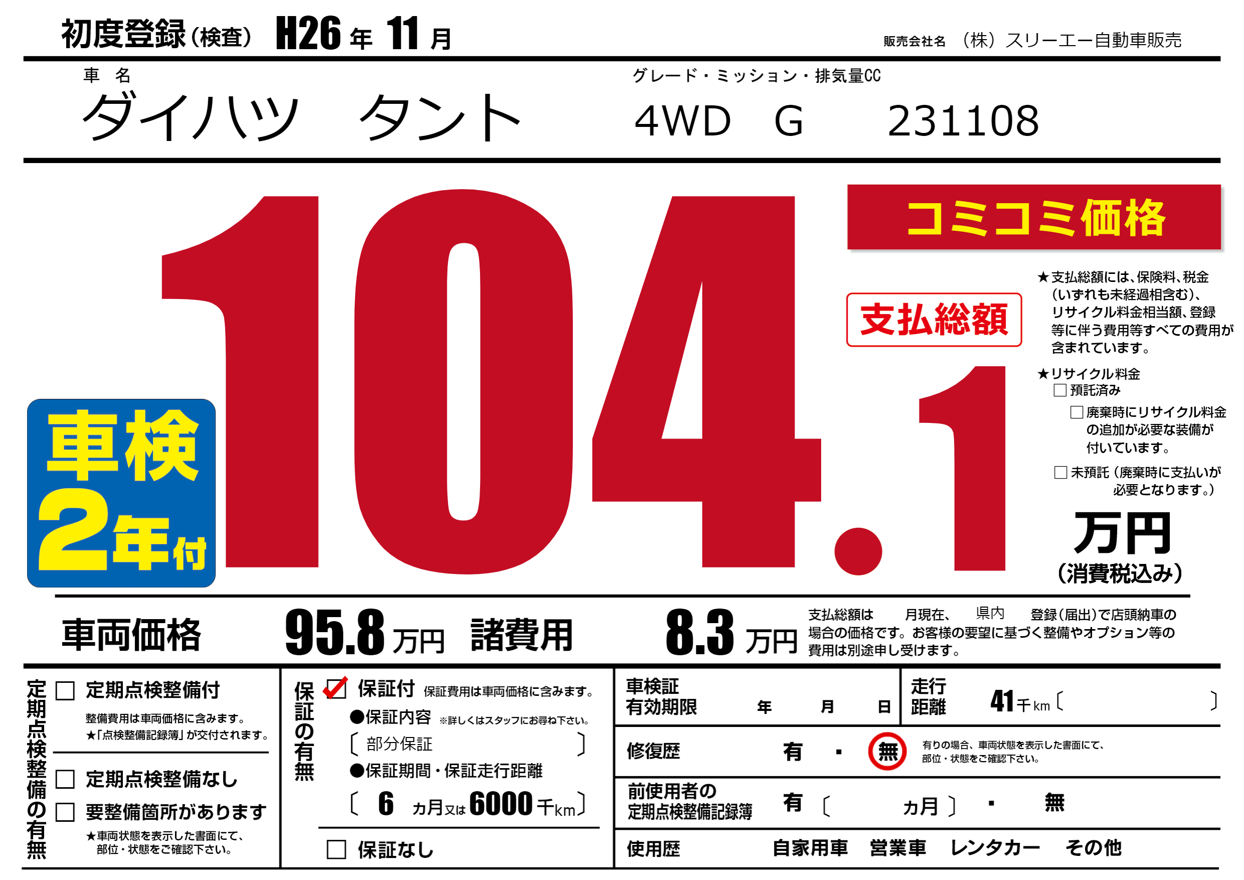 | 走行キロ | 4.1万km | 初年度登録 | H26年11月 |