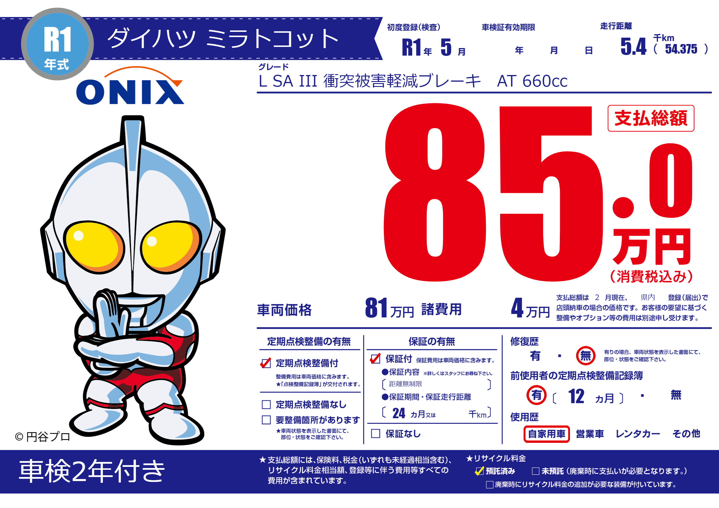 | 車名 | ダイハツ ミラトコット | グレード ミッション 排気量 |