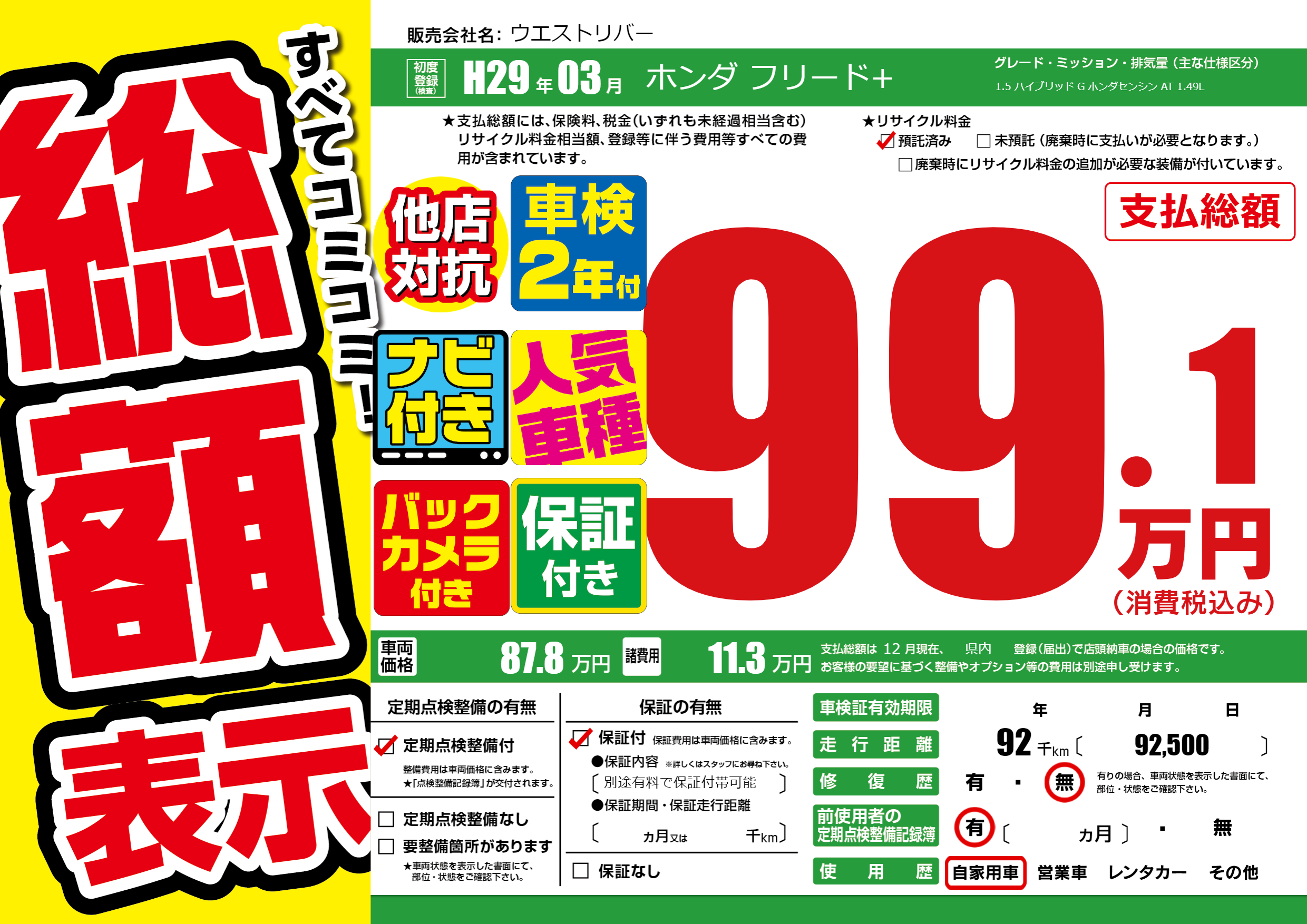 | 走行キロ | 9.2万km | 初年度登録 | H29年03月 |