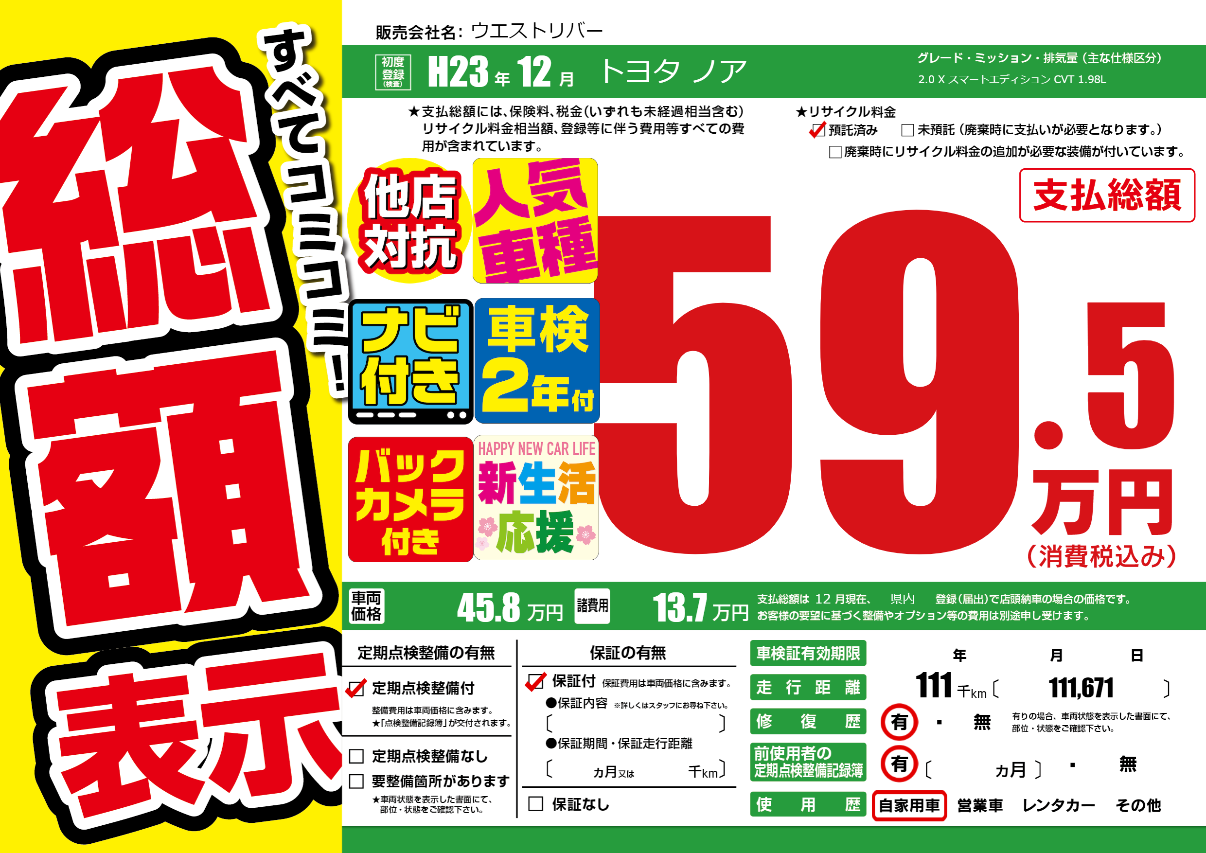 | 走行キロ | 11.1万km | 初年度登録 | H23年12月 |