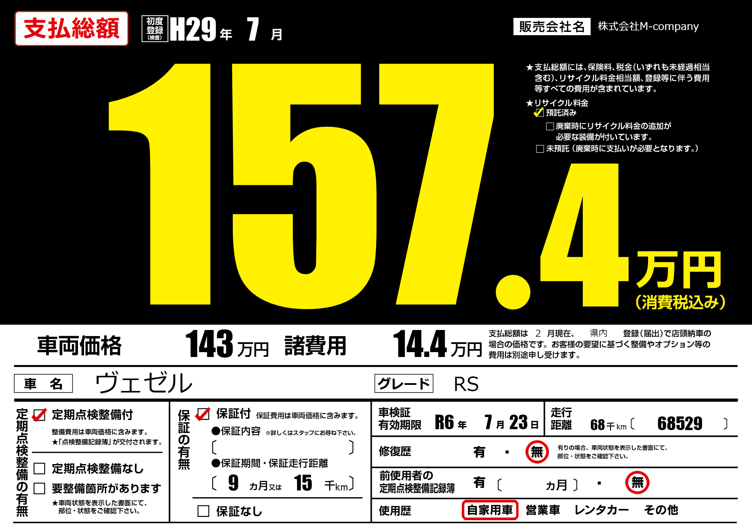 | 走行キロ | 6.8万km | 初年度登録 | H29年7月 |